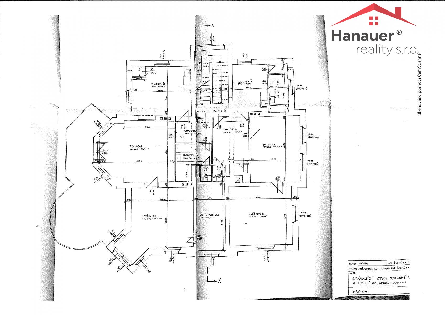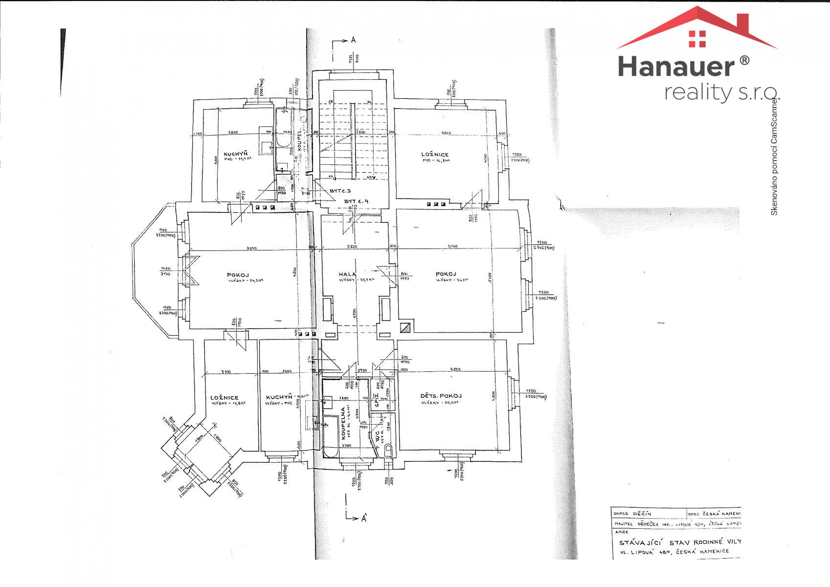 Nabízíme k prodeji rozlehlou prvorepublikovou vilu v malebné obci Česká Kamenice, na rozhraní Lužických hor a Českosaského Švýcarska. Dům momentálně funguje jako nájemní objekt s pěti samostatnými bytovými jednotkami, možnost okamžitého výnosu z pronájmu. Rozmístění bytů v domě je: 1. podlaží byt 2+1 a 3+1, 2. podlaží byt 3+1 a 2+1, 3 podlaží byt 2+1.