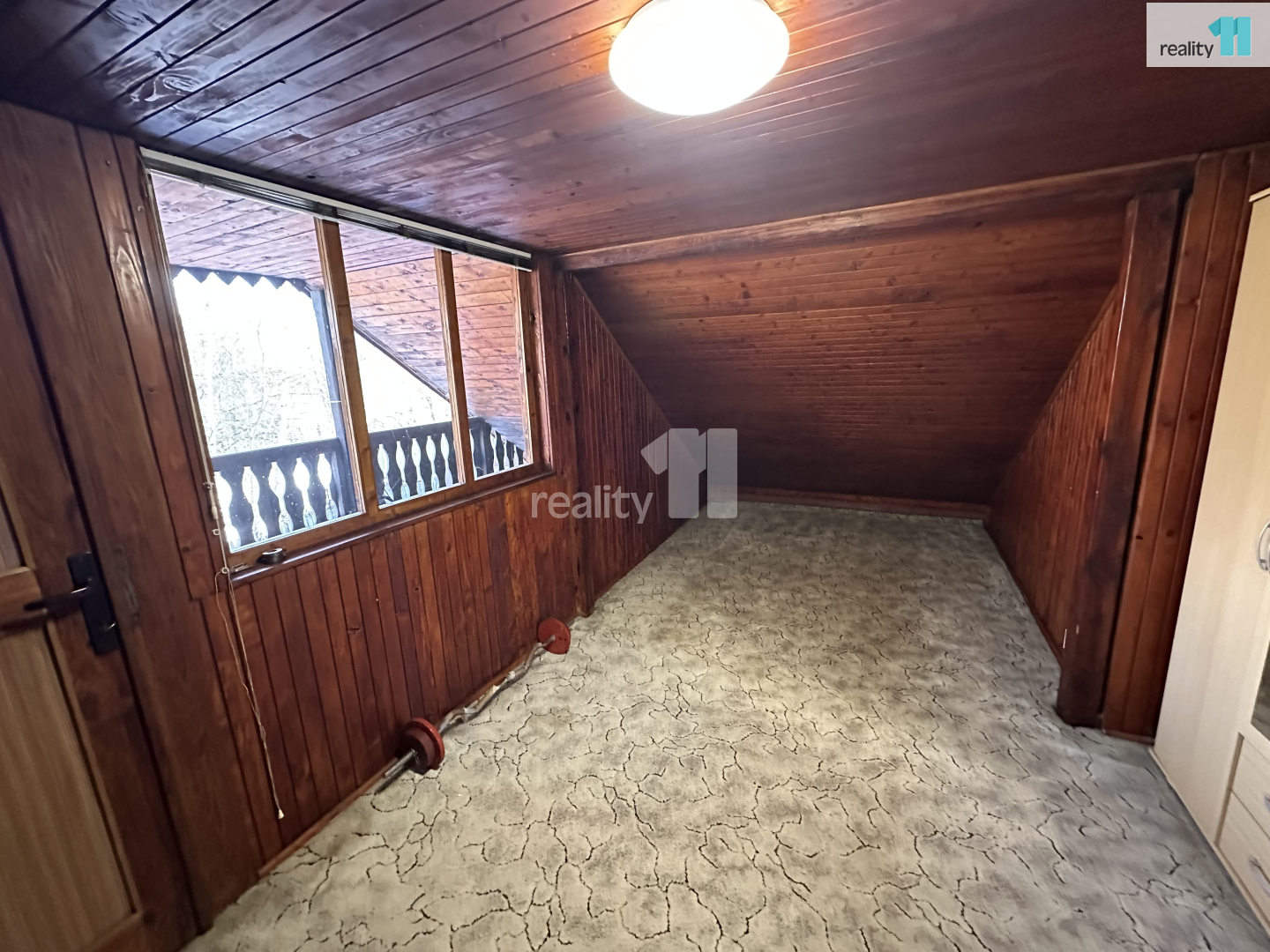 Přízemí: Vstupní chodba, umývárna s WC, obytná místnost s krbem, kuchyň, dřevěné schodiště do podkroví. Částečně nový štuk a výmalba.