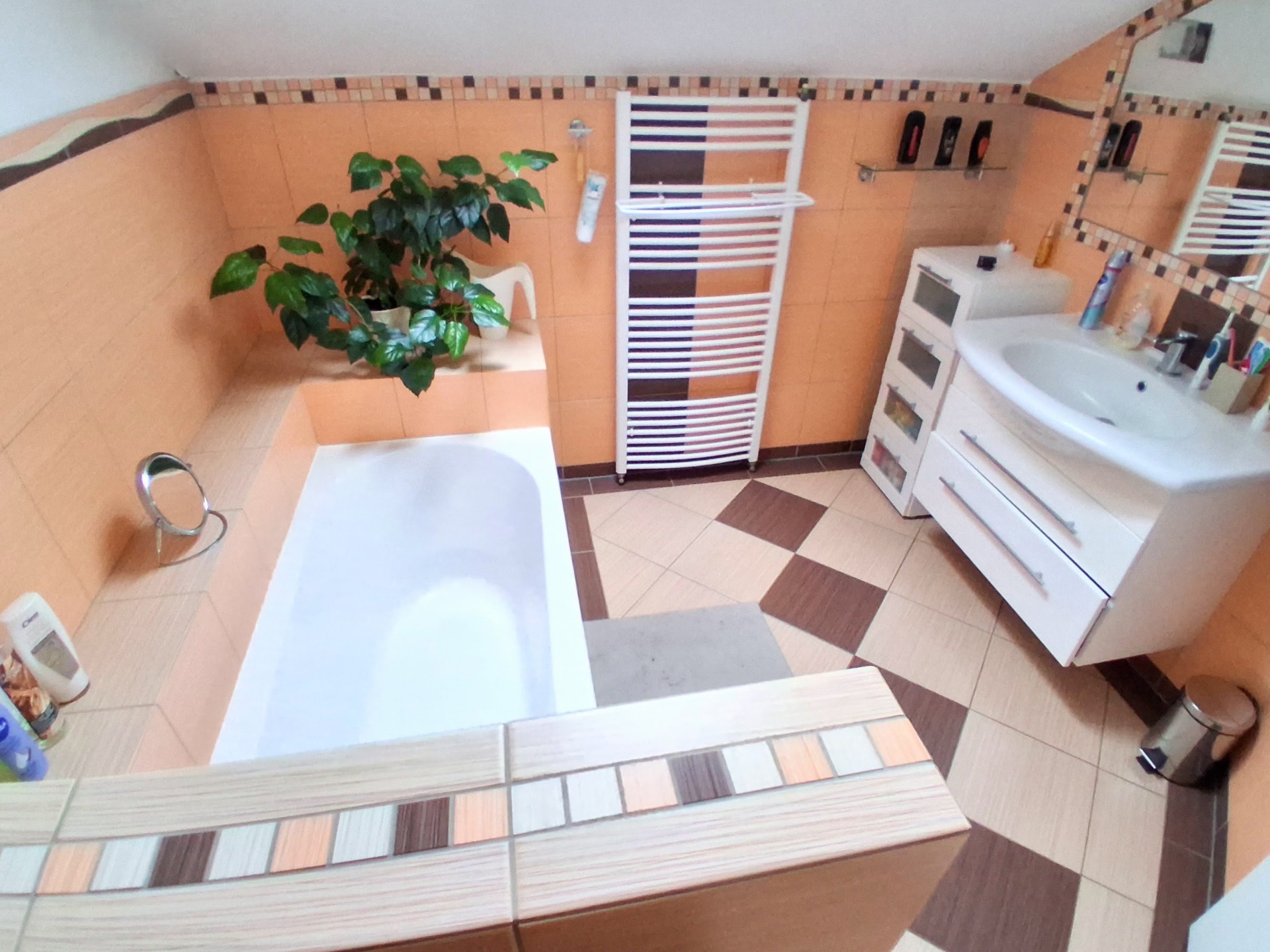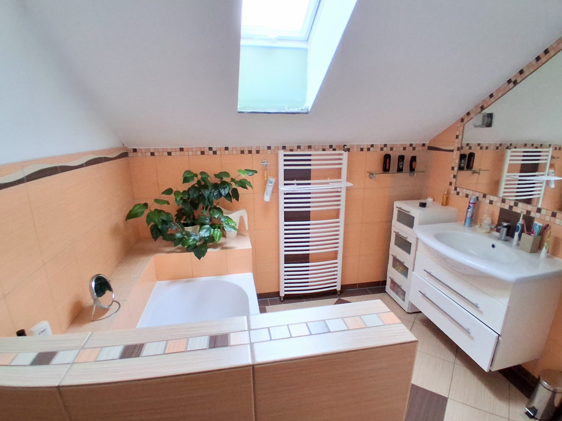Dispozice: přízemí (1. NP) - Srdce domu tvoří prostorný obývací pokoj s kuchyňským koutem (vestavěné spotřebiče), koupelna se sprchovým koutem a WC, technická komora a vstup na terasu, patro (2. NP) - tři samostatné neprůchozí pokoje - ideální pro klidný spánek celé rodiny, druhá koupelna s vanou a WC.