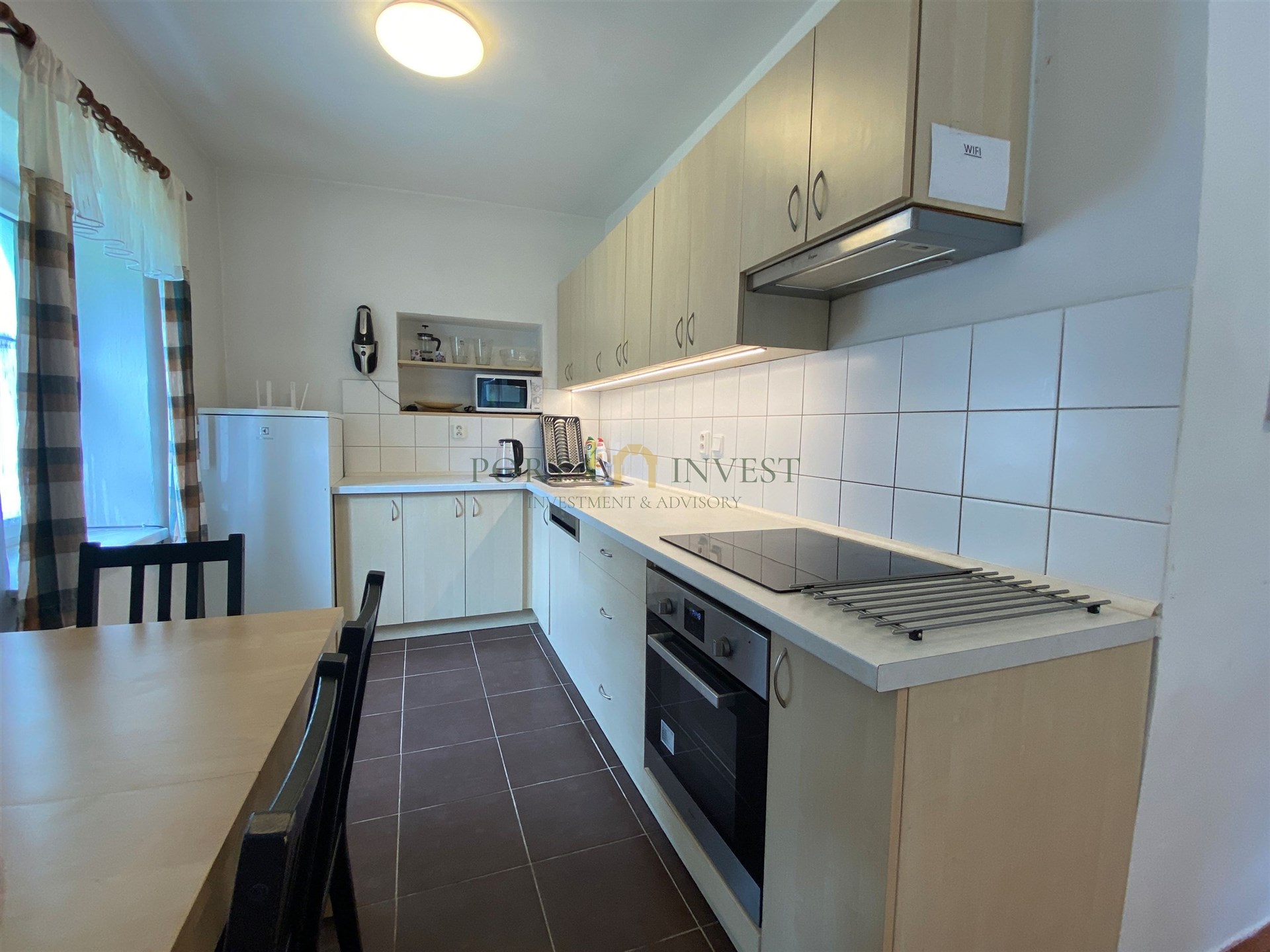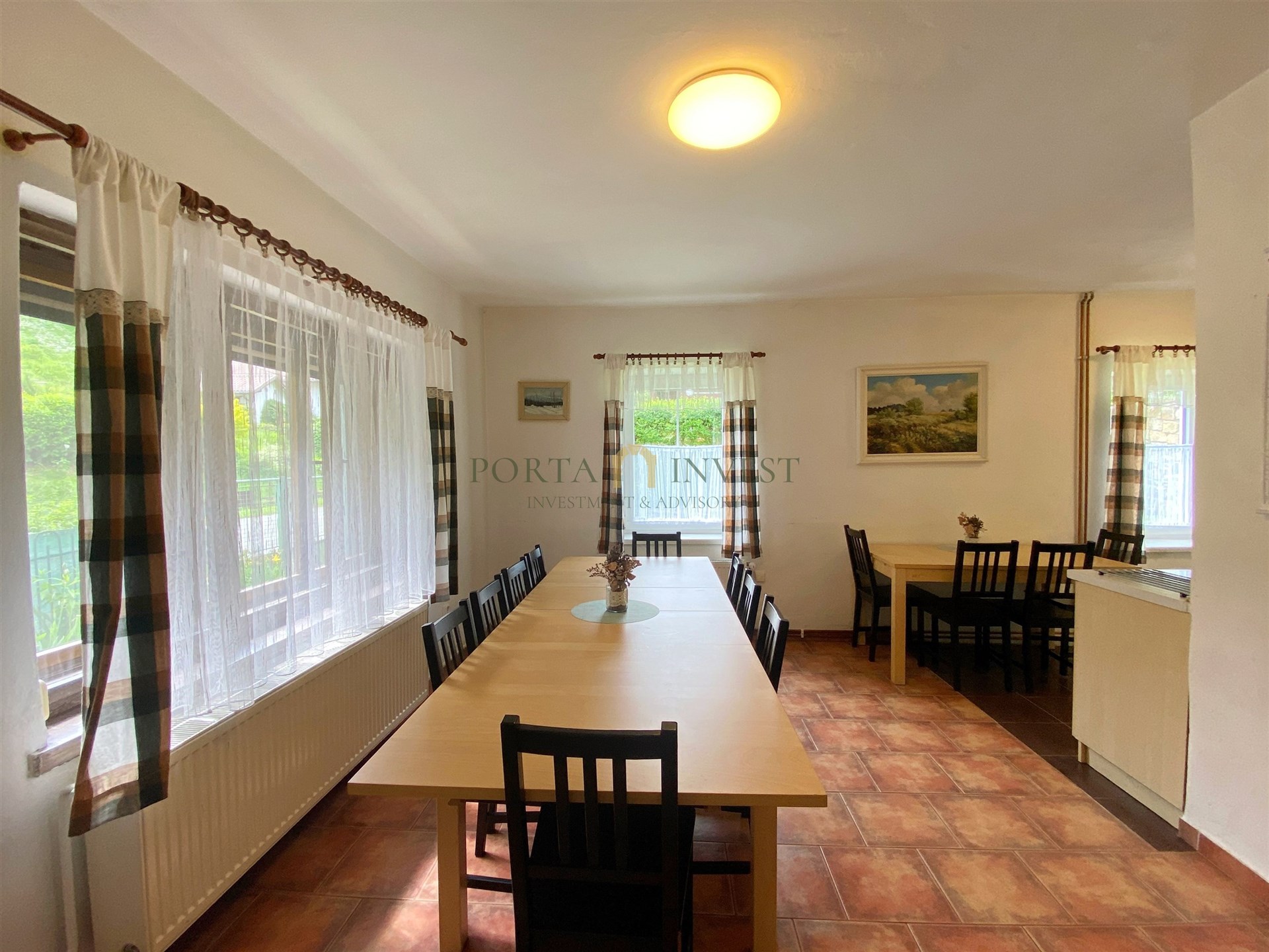 Do domu vstoupíte přes praktické zádveří a hlavní chodbu. V přízemí jsou centrálními místnostmi velkorysý obývací pokoj s dřevěnou plovoucí podlahou a oddělená kuchyně s velkou jídelnou. Kuchyně je plně vybavená: Je zde elektrická varná deska, trouba, digestoř, lednice, myčka i mikrovlnná trouba. Přízemí se dále nachází sociální zázemí – tři koupelny se sprchovými kouty a tři toalety, technická místnost, úklidový prostor a průchod do prostorné garáže. V horním patře najdete čtyři další místnosti (aktuálně ložnice s celkem patnácti lůžky) s PVC na podlahách. Okna budovy směrem do ulice jsou dřevěná špaletová s předokenními žaluziemi, jinde plastová. Vytápění zajišťuje elektrokotel napojený na rozvody ústředního topení v celém domě. Nemovitost je napojena na veřejný vodovod, elektřinu a internet, kanalizace je řešena jímkou, ohřev vody zajišťuje bojler.