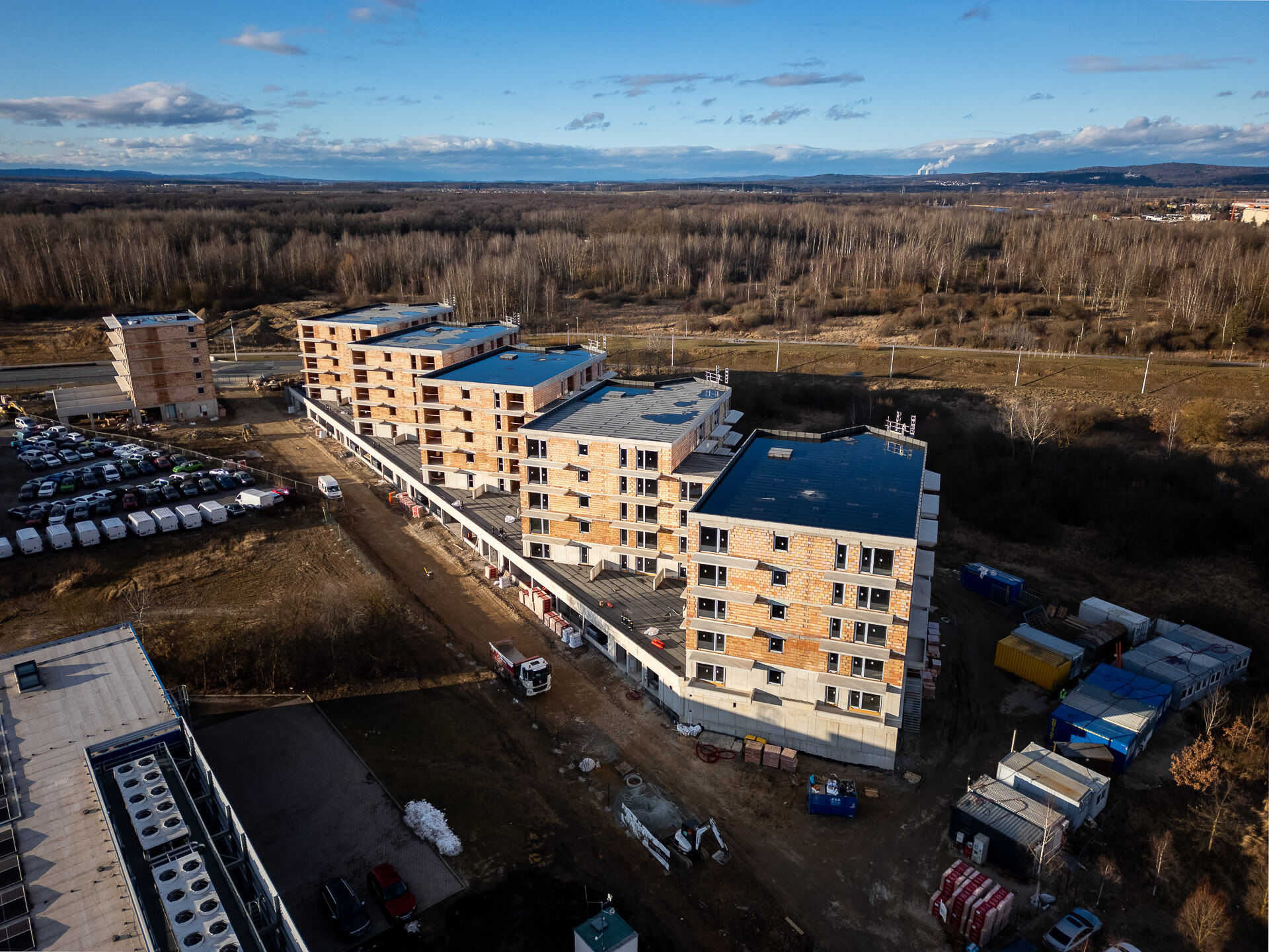 Nabízený byt v této inzerci je dispozice 3 + kk o výměře 68,20 m2 a jeho příslušenstvím je unikátní jižně orientovaná terasa o výměře 65,97 m2. Obrovská terasa nabídne místo nejen pro umístnění zahradního nábytku, ale třeba vířivky a možnost zřízení vlastní zahrádky uprostřed města. Byt č. 2.3 se nachází v 2. NP šestipodlažního bytového domu s výtahem BYTY 4 DVORY, dům B. Výhodou je skutečnost, že v bytovém domě se nachází pouze 15 bytů. Předpokládaný termín dokončení stavby je prosinec 2025. Dispoziční řešení bytu: ze vstupní chodby (9,74 m2) je přístupná koupelna (6,34 m2). Vstupní chodba umožňuje umístnění vestavěných skříní. Z chodby je dále přístupné všechny obytné místnosti. Severně orientovaný pokoj (9 m2), východně orientovaná ložnice (12,16 m2) a obytný prostor (28 m2) s kuchyňským koutem, který je orientován na jižní stranu. Z obytného prostoru, který je prosvětlen velkou okenní sestavou je přímý vstup na terasu (65,97 m2). Standardní vybavení bytu: kvalitní zařizovací předměty koupelny (sprchový kout, umyvadlo, toaleta, přípojka pro pračku), obklady, dlažby, vnitřní dveře a podlahové krytiny.