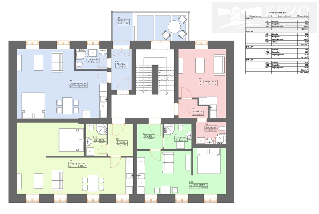 (k dispozici také byt v prvním patře č. 6 – výměra 42 m² + terasa 14m2 a byty v podkroví 2+kk byt č.9 (42,83m2) , byt č. 10 – dispozice 1+kk s velkou ložnicí v nice téměř 2+kk (41,36 m2).)