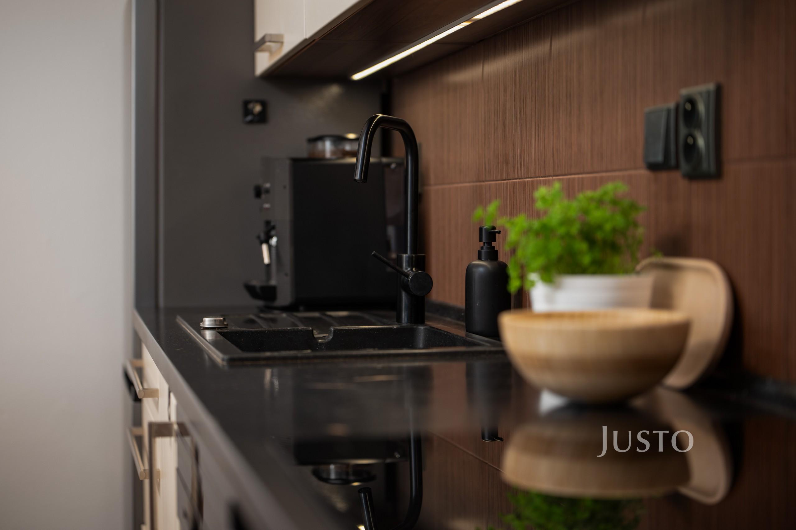 Hlavní obytná místnost s vinylovou podlahovou krytinou je propojená s kuchyňským koutem a využívá každý centimetr na maximum. Kuchyně s ostrůvkem, spací část, pracovní kout a home-office na slunném balkóně. Moderní kuchyňská linka na míru poskytuje kompletní vybavení spotřebiči – indukční varná deska, horkovzdušná trouba, digestoř s odtahem, myčka, mikrovlnná trouba i lednice s mrazákem. Prostor působí velmi příjemně a nabízí dostatek místa nejen pro odpočinek, ale i pro práci z domova nebo studium.