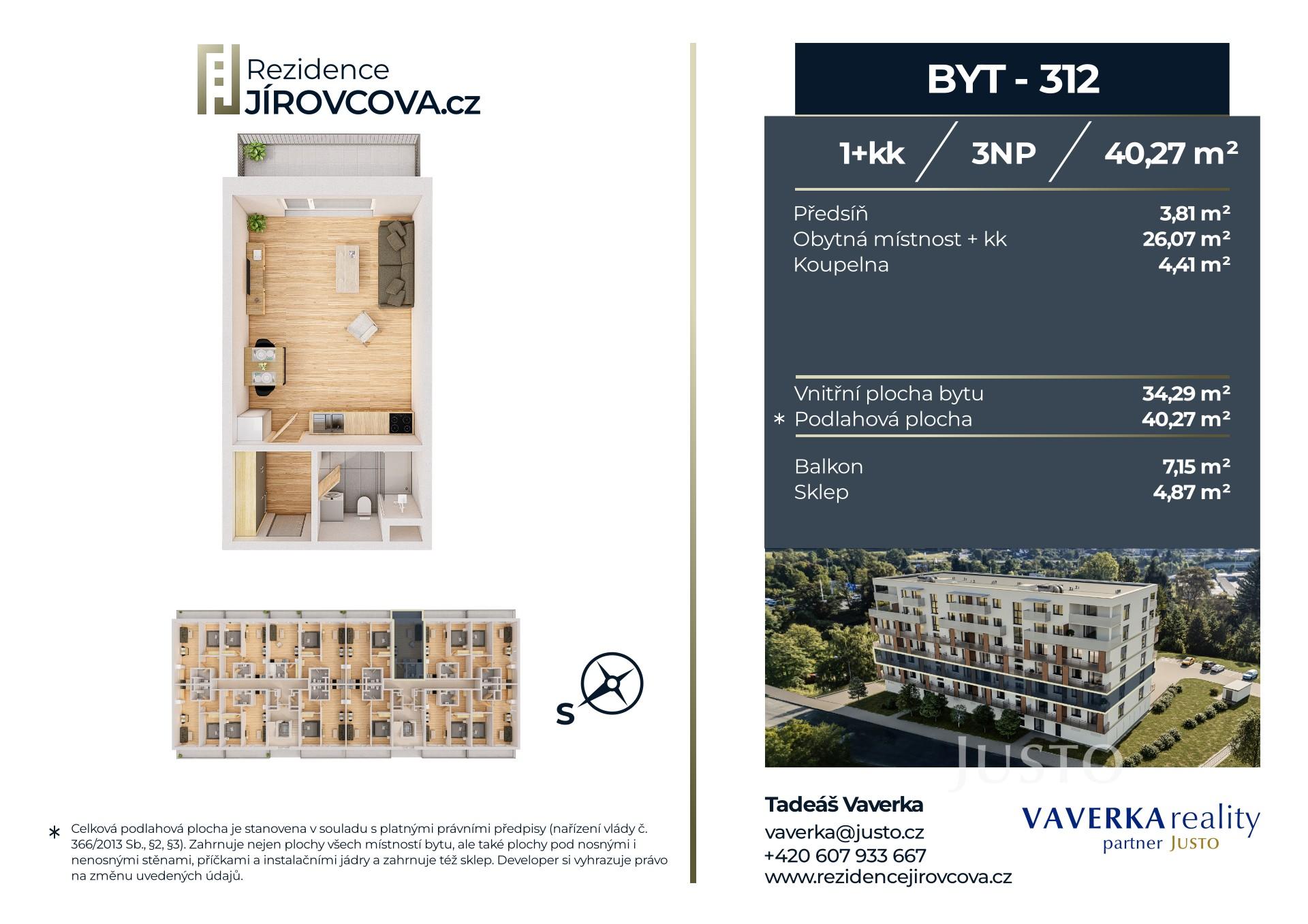 Tento byt číslo 312, o dispozici 1+kk se nachází v 3. nadzemním podlaží.