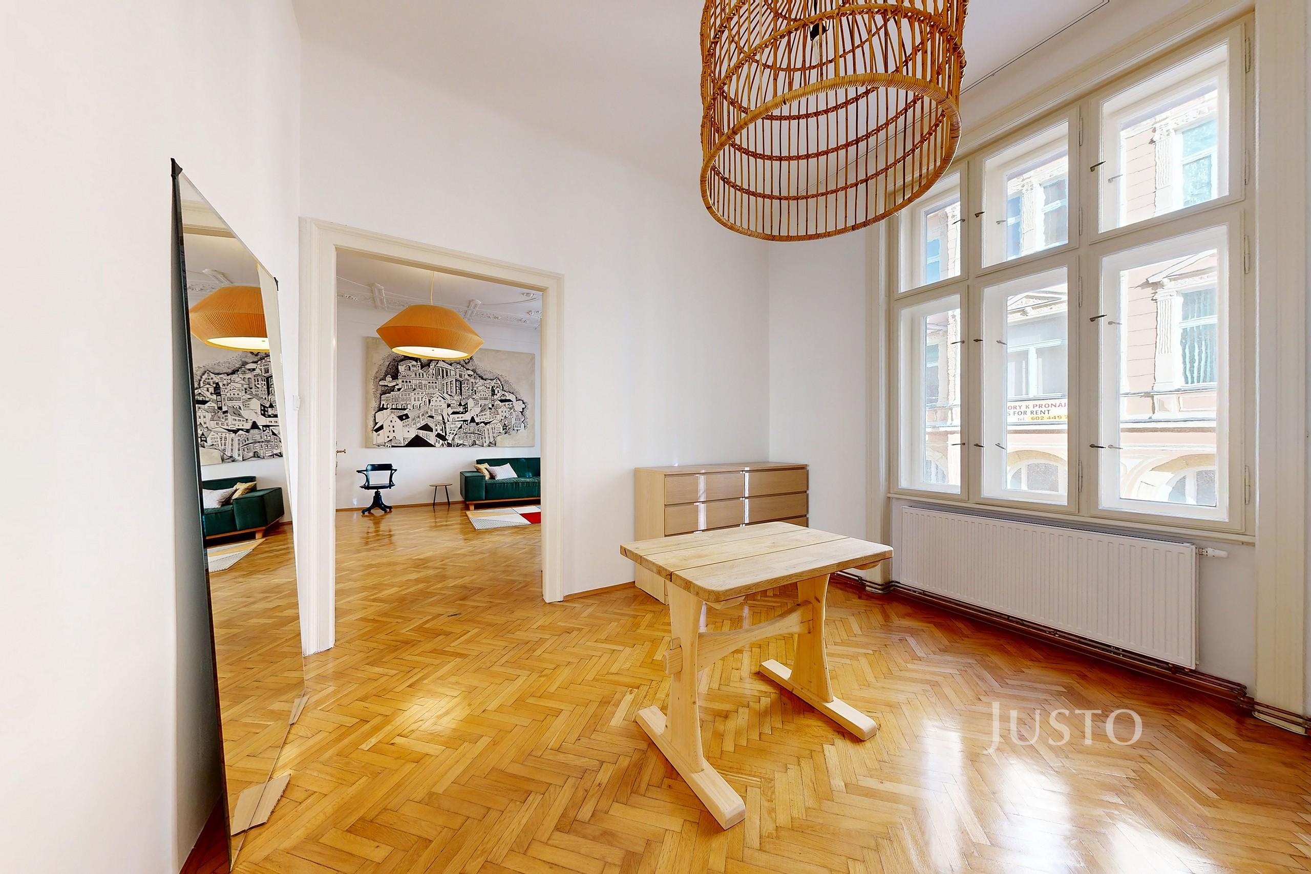 Prostorný a světlý obývací pokoj s krbem má nádherné vysoké stropy s ornamenty, které Vás zaujmou. Výhled budete mít přímo do ulice a na také na náměstí.