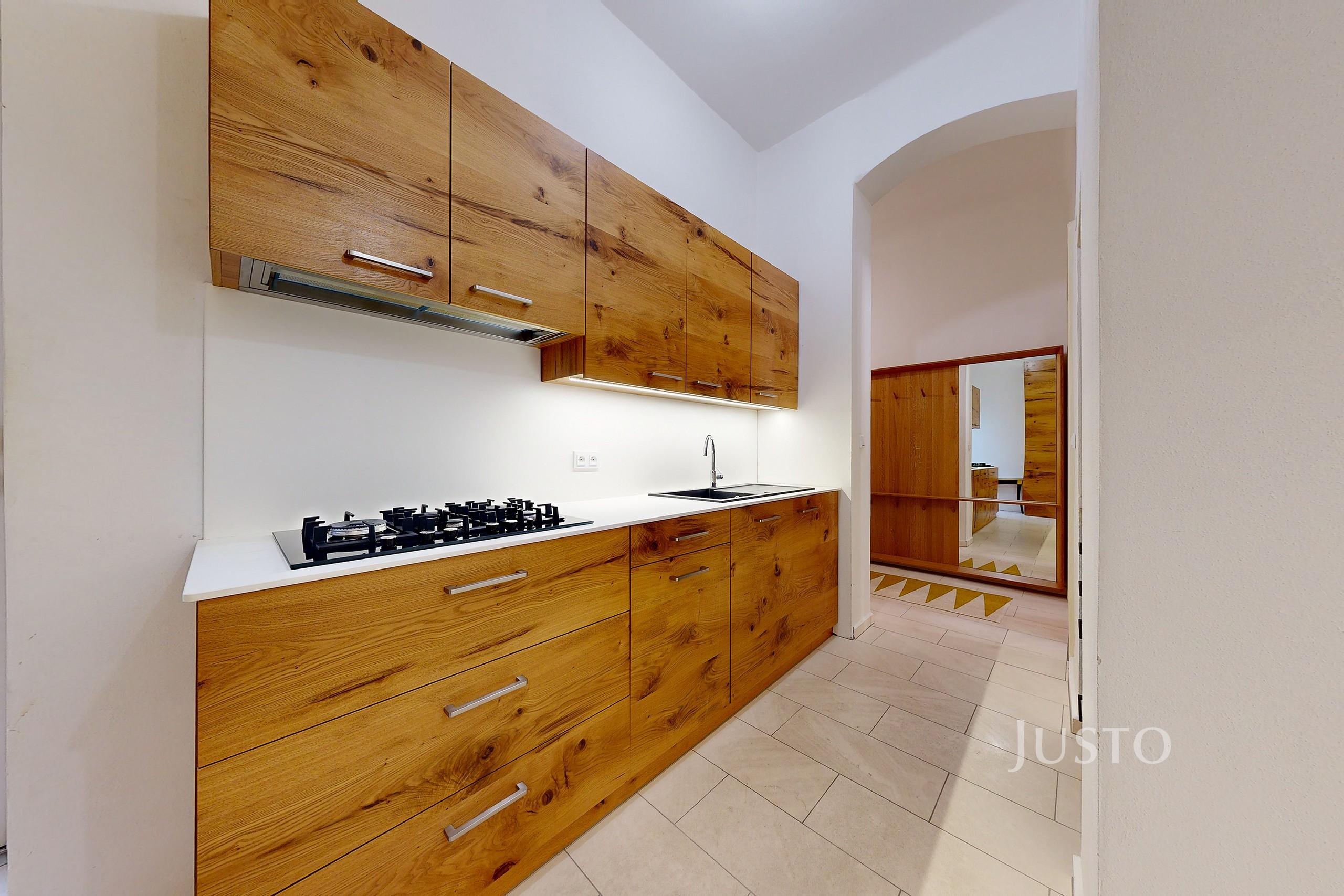 Přestože můžete na fotografiích vidět moderní, plně vybavenou kuchyň (plynový sporák, digestoř, lednice, myčka, trouba) majitel při rekonstrukci ctil atmosféru celého bytu. Samozřejmě nechybí vkusná koupelna se sprchovým koutem, umyvadlem a toaletou. V zimě Vás určitě potěší podlahové vytápění (koupelna, chodba, kuchyň). O ohřev vody a vytápění se v bytě stará plynový kotel. Neprůchozí ložnice přímo vybízí k odpočinku a její okna jsou orientována do vnitrobloku.