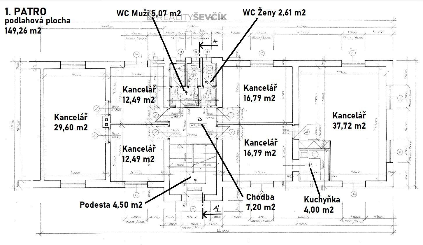 1. patro (149 m²): kancelářské prostory, sociální zázemí včetně kuchyňky