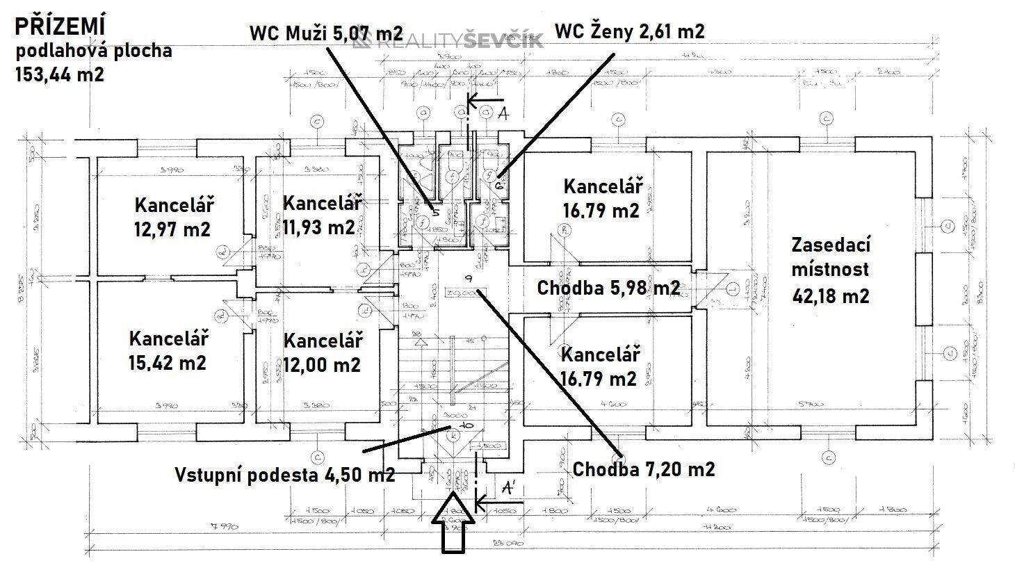 Přízemí (153 m²): kanceláře, skladové prostory, sociální zázemí pro zaměstnance i klienty
