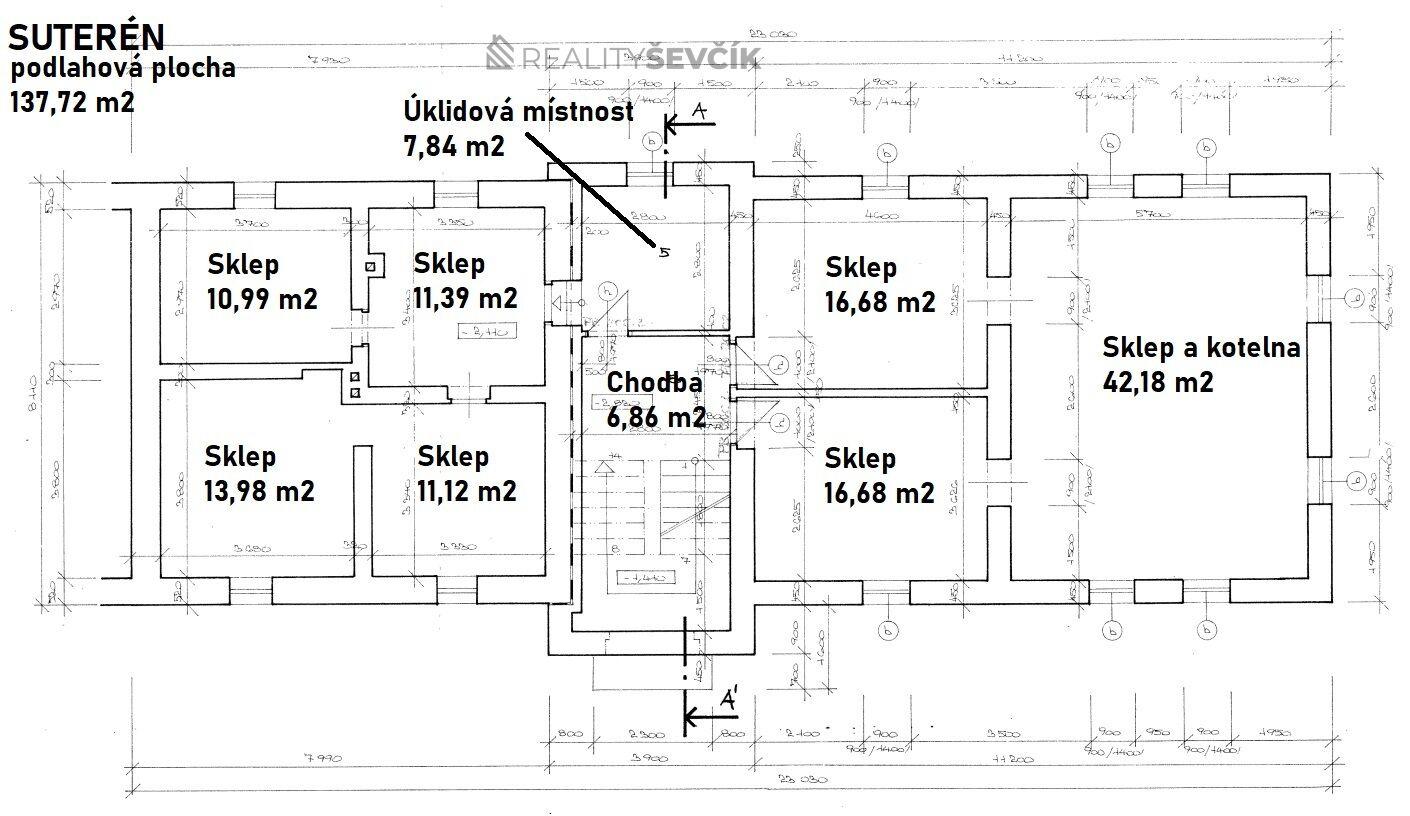Suterén (137 m²): skladovací prostory, výměníková stanice, technické zázemí, úklidová místnost