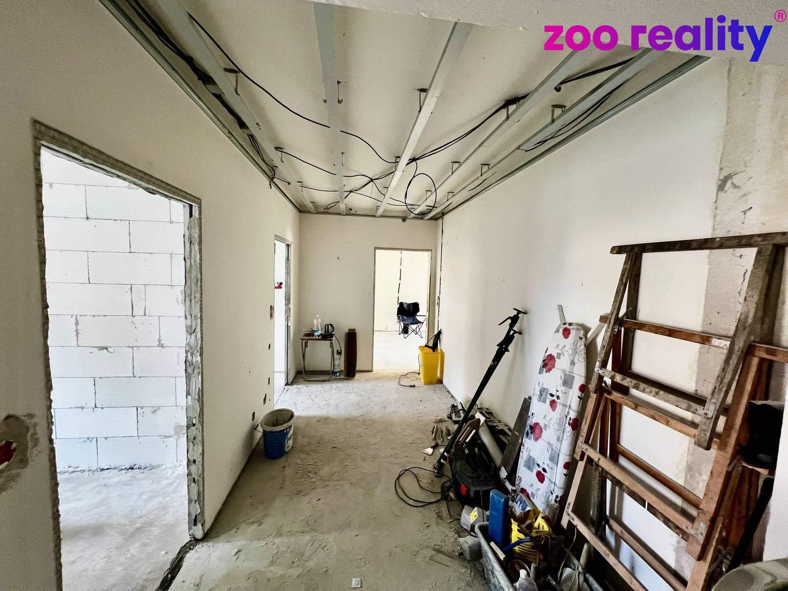 Byt právě prochází důkladnou kompletní rekonstrukcí, takříkajíc, od podlahy až po strop.