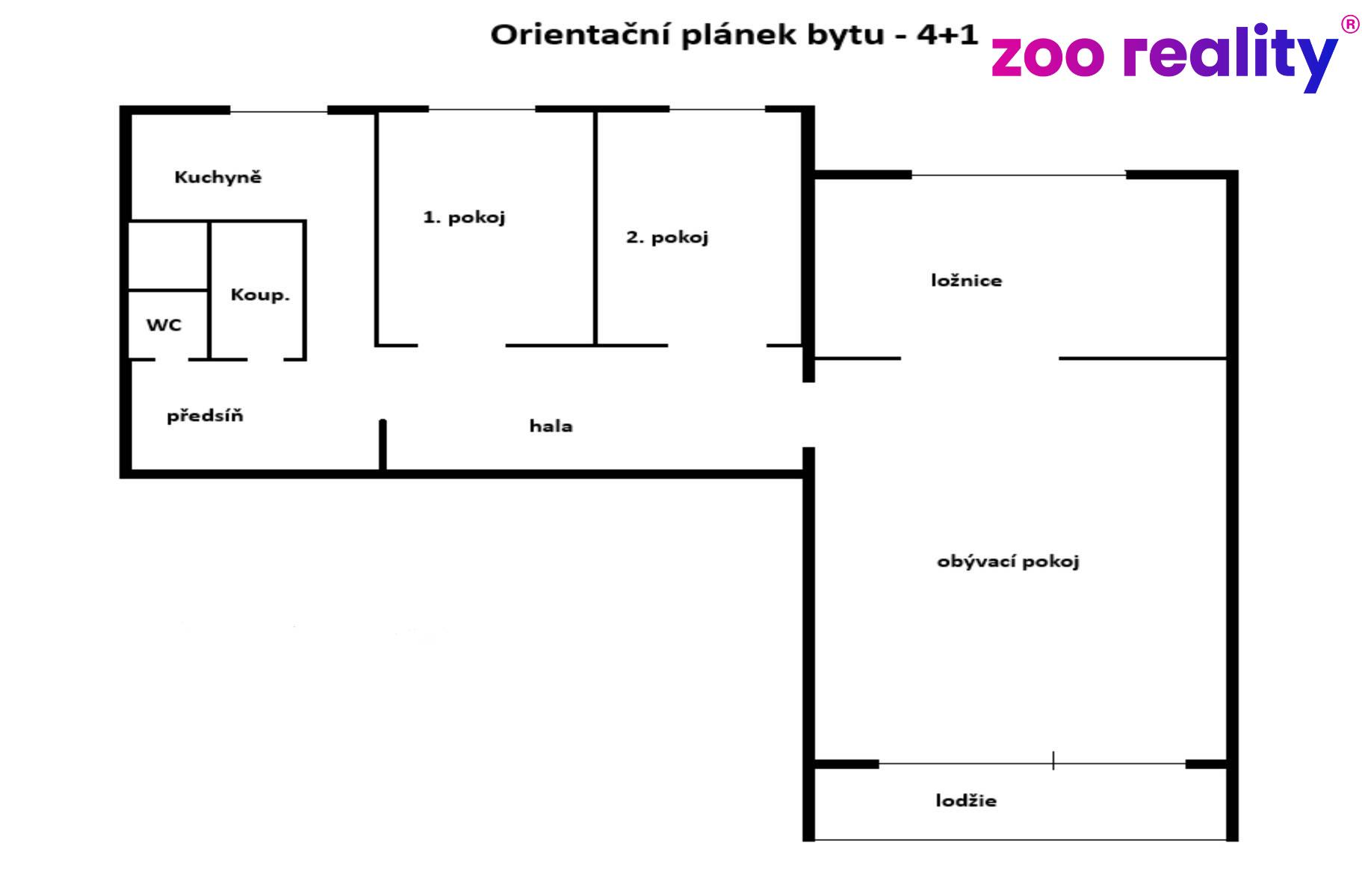 Byt disponuje vstupní chodbou, halou, kuchyní, dvěma dětskými pokoji, obývákem s lodžií a ložnicí.