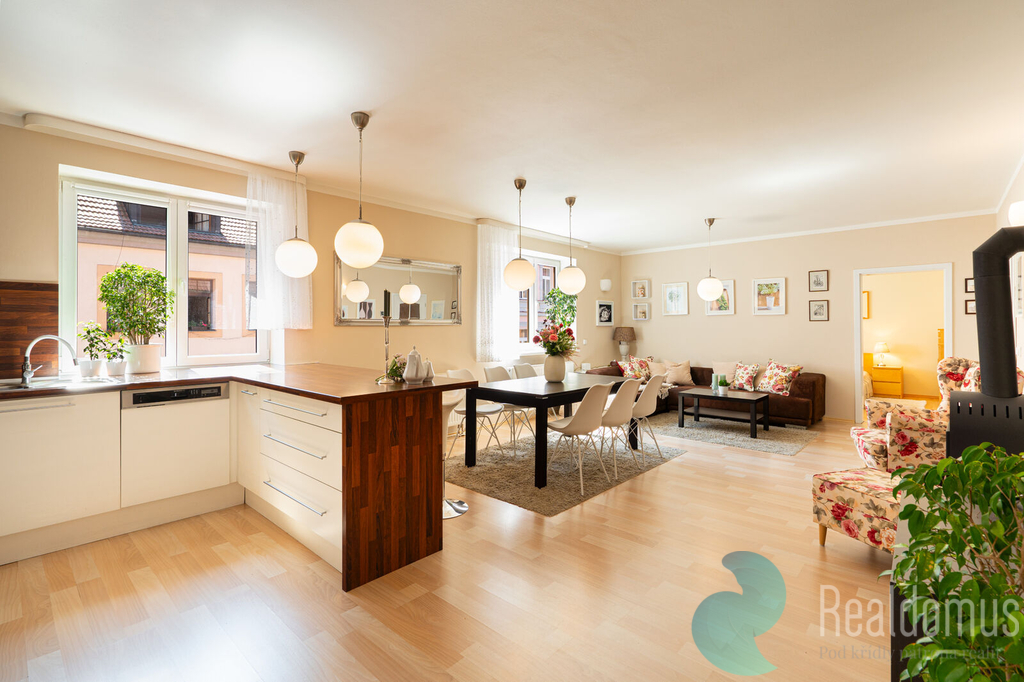 Ve 2. NP je pak velký, stylový a prosvětlený podkrovní byt 3kk (104 m2) s nádhernou novou kuchyní a místností se saunou, Byt má velkorysou hlavní obytnou místnost (41 m2) s kuchyňským koutem, jídelnou a obývacím pokojem s krbovými kamny. Dále zde najdeme ložnici, dětský pokoj, koupelnu s vanou, sprchovým koutem a toaletou, Další toaleta se nachází v místnosti u vchodu do bytu, kde je i velké vestavěné umyvadlo a sauna.