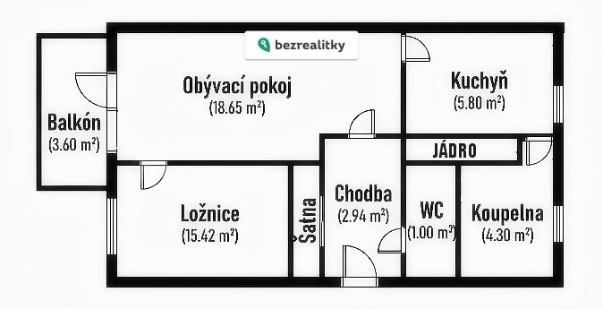Byt po částečné rekonstrukci má funkční a osvědčenou dispozici což z něj činí ideální variantu jak pro pár, menší rodinu, tak i pro dlouhodobý pronájem. Ze vstupní chodby (2,94 m²) se dostanete na samostatné WC (1 m²), do kuchyně (5,80 m²) a obývacího pokoje (18,65 m²). Na obývací část navazuje ložnice (15,42 m²), která tvoří příjemnou klidovou zónu. Z kuchyně je pak vstup do koupelny (4,30 m²).