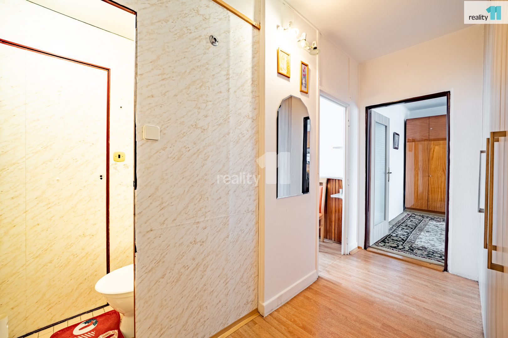 Dispozice bytu je řešena promyšleně. Ze vstupní chodby se dostanete na samostatné WC, do kuchyně i obývacího pokoje. Na obývací část navazuje ložnice, která tvoří příjemnou klidovou zónu. Z kuchyně je pak vstup do koupelny. Celkové uspořádání působí logicky, přehledně a přirozeně odděluje denní a odpočinkovou část bydlení.