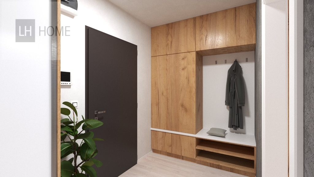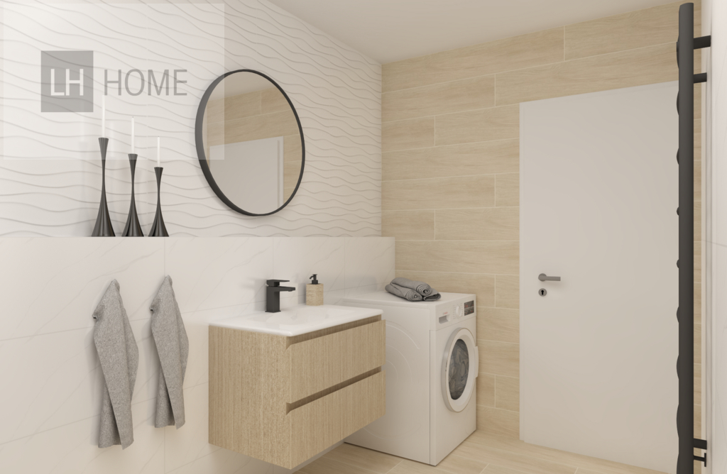 vinylové podlahy, obklady a dlažby, vana, koupelnová skříňka, topný žebřík, závěsné WC, interiérové dveře, videotelefon, předokenní rolety.