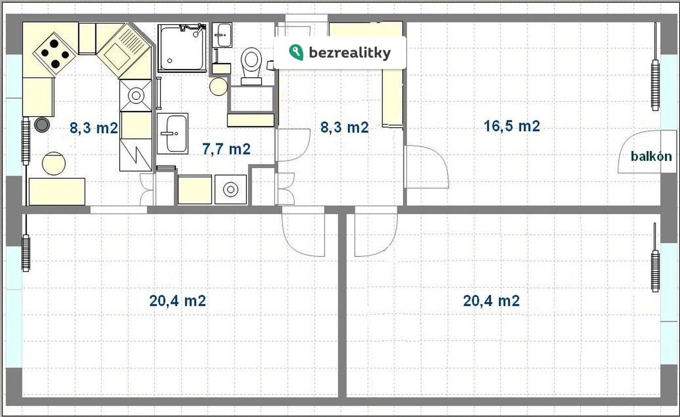 • tři prostorné pokoje o velikostech 20,5 m² + 20,5 m² + 16,5 m², z toho dva neprůchozí