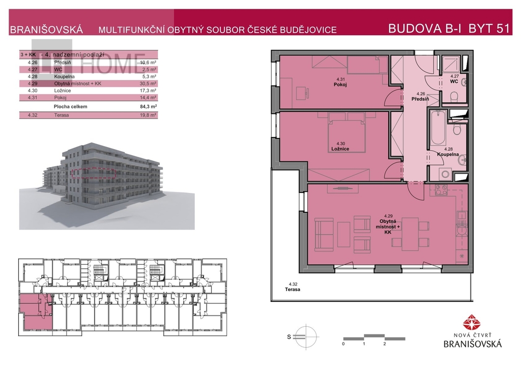 Nabízíme prodej bytu 3+kk o výměře 84,30 m² s balkonem 19,80 m² v moderním rezidenčním projektu Nová čtvrť Branišovská v Českých Budějovicích.