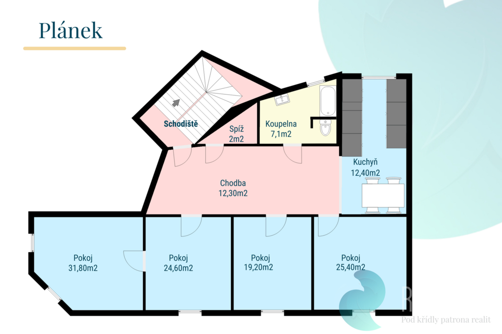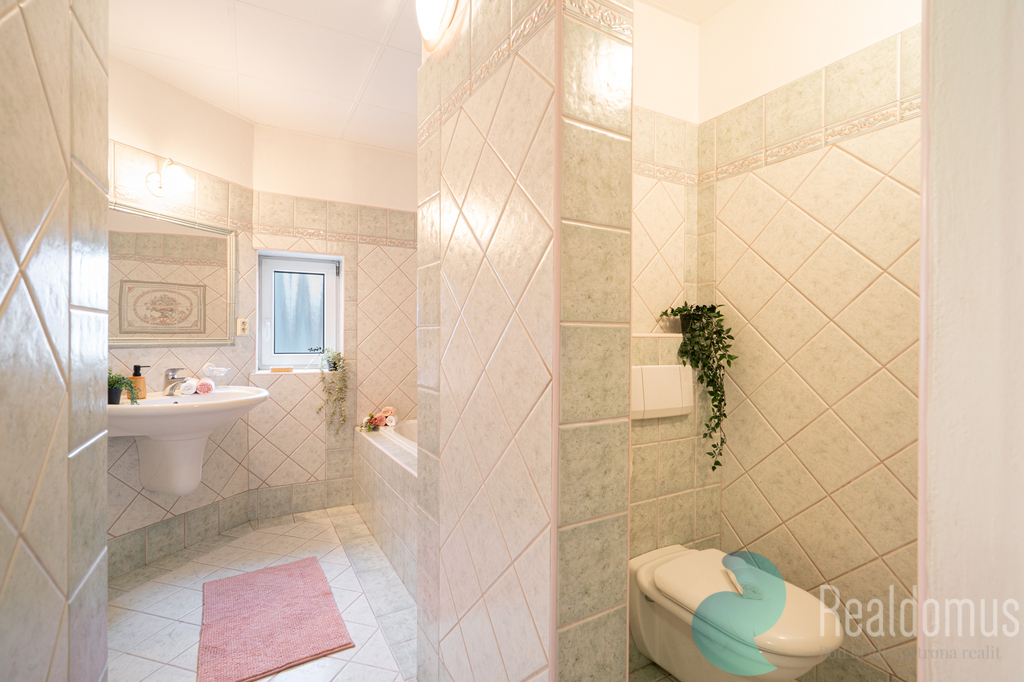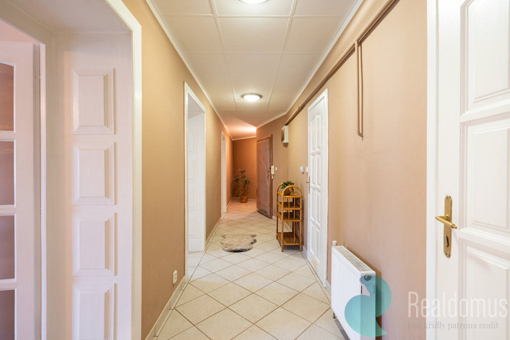 Disponuje prostornou vstupní chodbou s místem pro šatnu (12,30 m²). Kuchyní, kde se bez problému vejde i jídelní stůl (12,40 m²) a čtyřmi pokoji: pokoj č.1 (31,80 m²), pokoj č.2 – 25,40 m², pokoj č.3 – 24,60 m² a pokoj č.4 – 19,20 m². Pouze dva pokoje jsou neprůchozí. Dále je zde koupelna s vanou, sprchovým koutem, toaletou (7,10 m²). Skvělá je praktická komora k umístění pračky, sušičky a dalších věcí (2,00 m²).