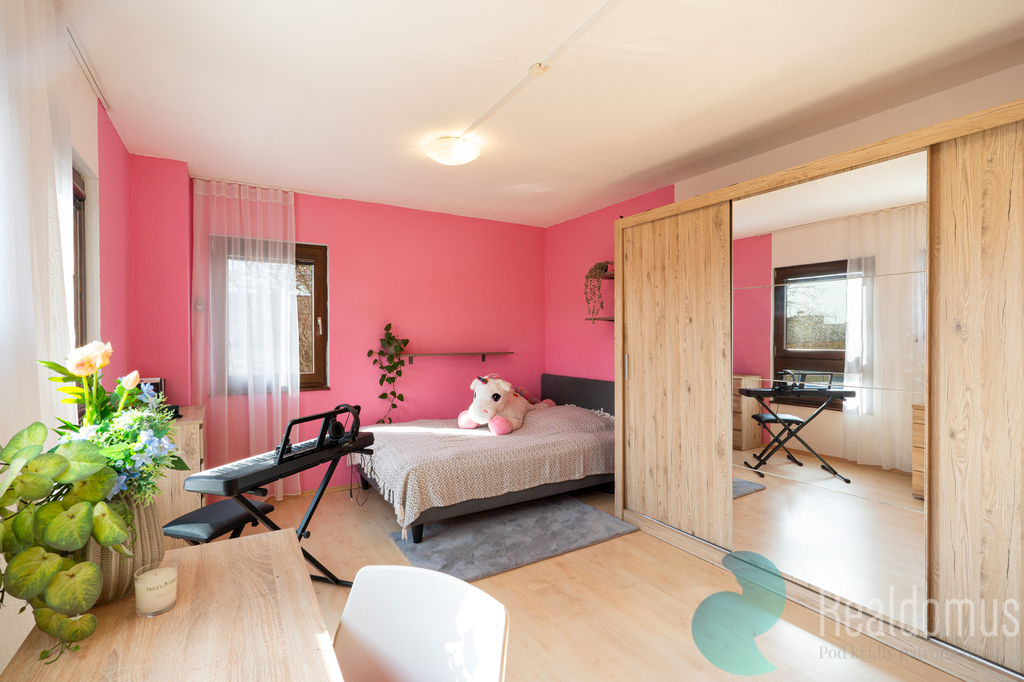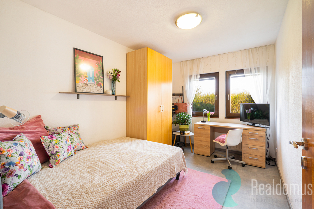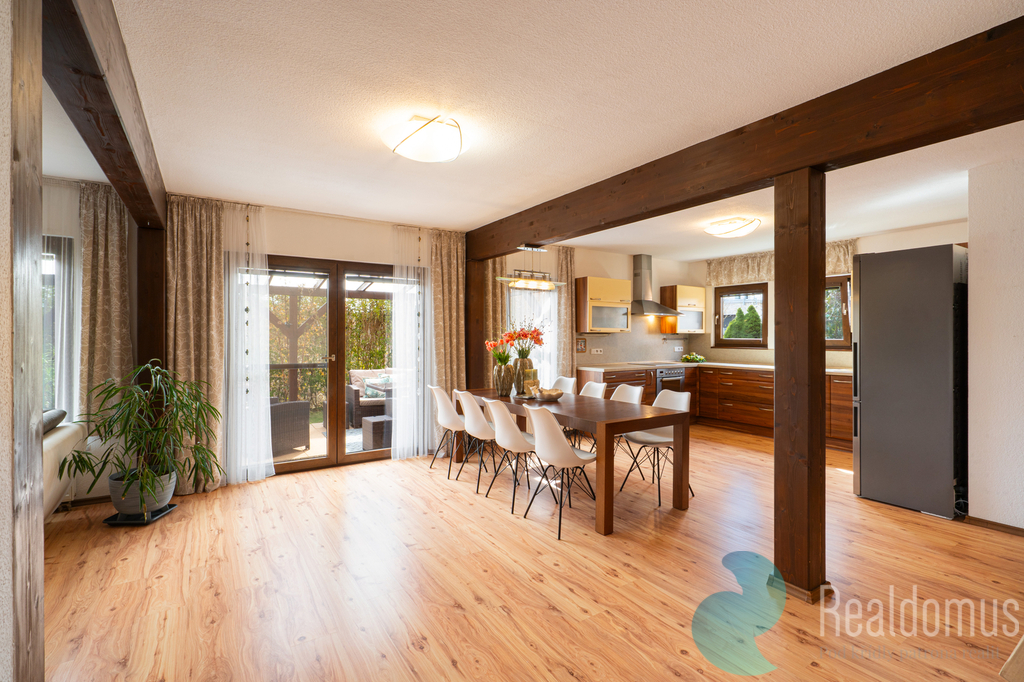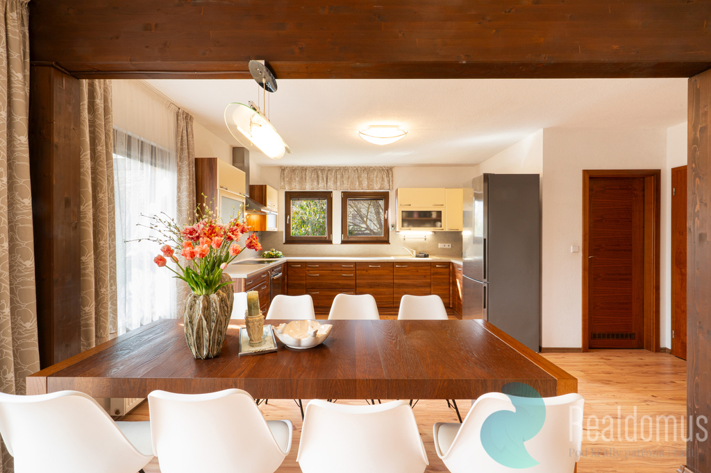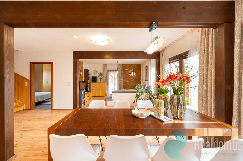 Dům o dispozici 5+kk je díky velkým oknům a přívětivé orientaci prosvětlený a vzdušný a nabízí dostatek prostoru i pro větší rodinu. V přízemí se nachází hlavní obytný prostor, který tvoří spojení prostorné kuchyně (17,70 m²), haly s jídelnou (16,07 m²) a obývacího pokoje s kamny (17,03 m²). Dále zde najdeme pokoj/pracovnu 10,77 m², koupelnu s toaletou (3,01 m²), komoru 2,27 m² a zádveří (3,29 m²). Podkroví tvoří odpočinkovou část domu, je zde hala 11,08 m² a tři samostatné neprůchozí pokoje (13,29 m², 19,06 m², 20,12 m²), dále koupelna s vanou a sprchou (8,55 m²) a samostatné WC (2,27 m²).