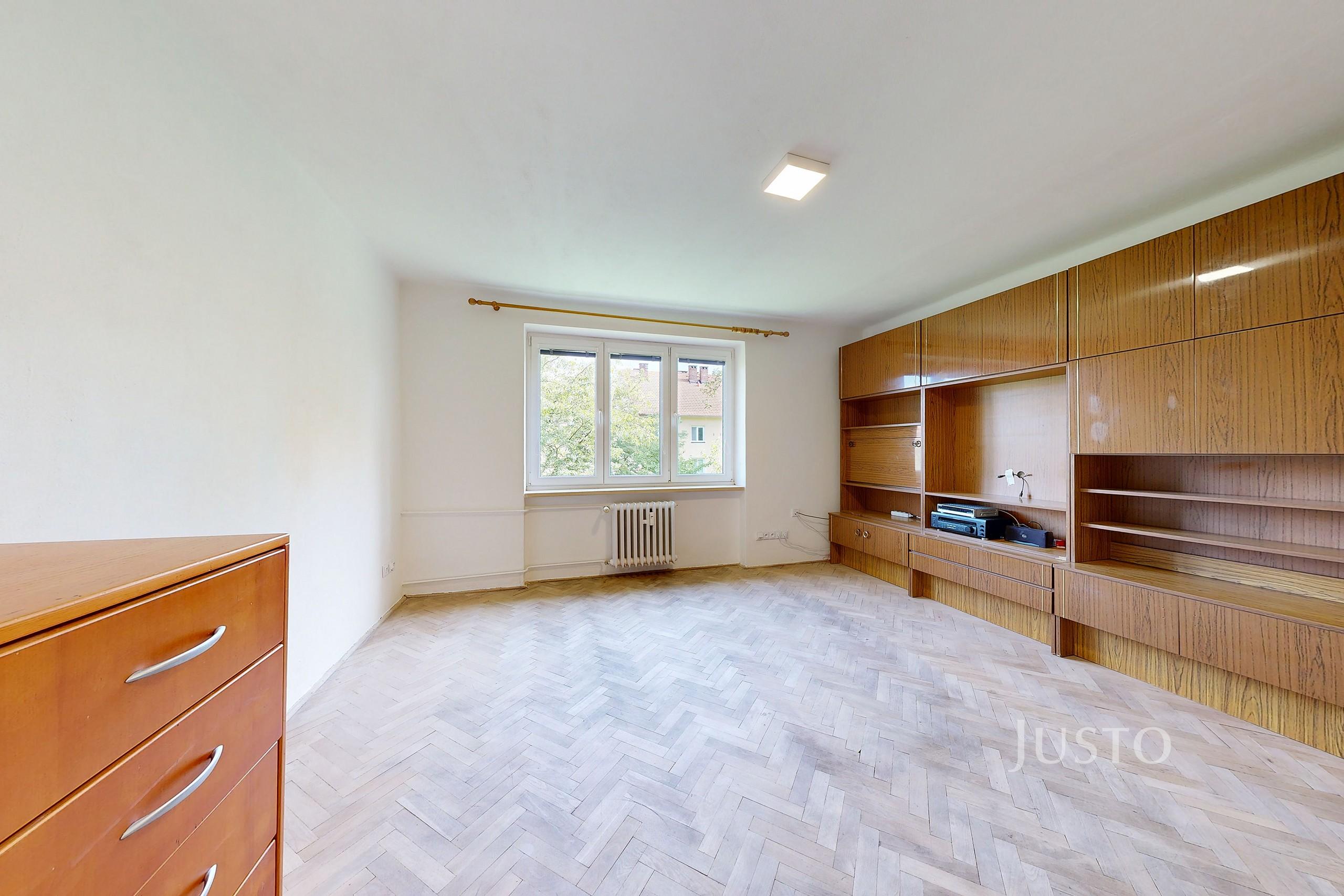 Z chodby i kuchyně můžete projít do obývacího pokoje, v kterém zůstala původní podlaha z dřevěných parket. Pokoj máte kromě obývací stěny a menší skříňky prázdný a můžete si jej přizpůsobit k obrazu svému.