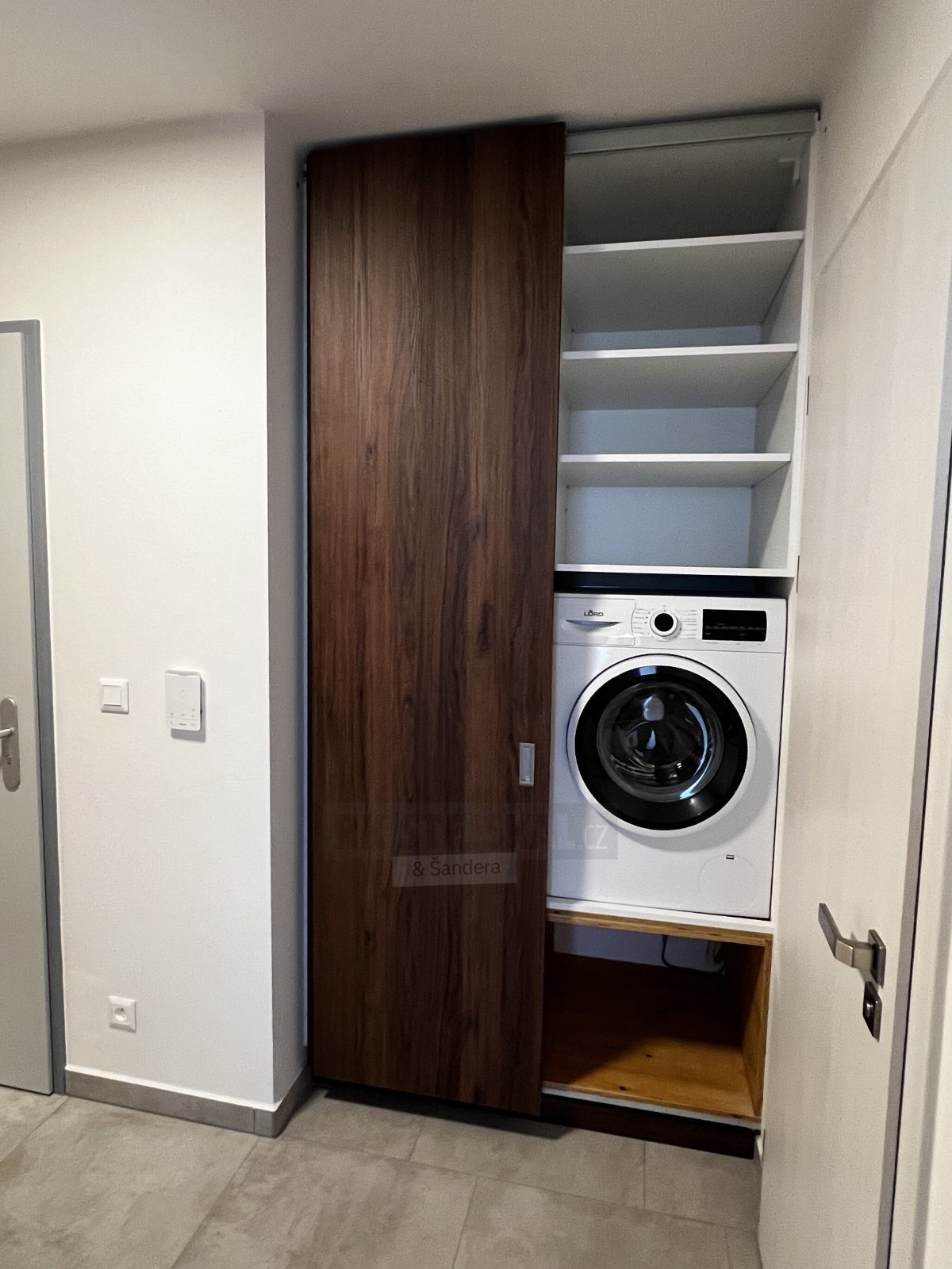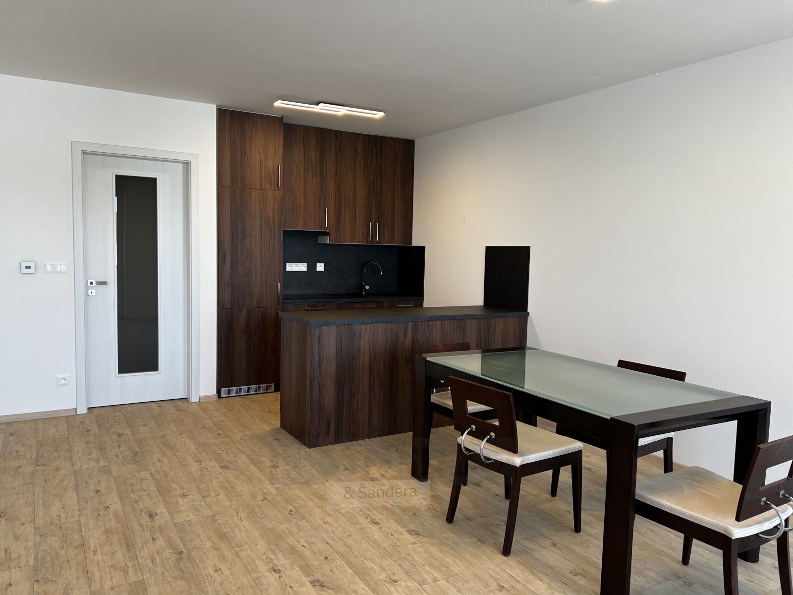 Dispozice bytu zahrnuje hlavní obytný prostor s plně vybaveným kuchyňským koutem (myčka, vestavná lednice a mrazák, varná deska, trouba), koupelnu se sprchovým koutem a předsíň se dvěma vestavěnými skříněmi. Díky praktickému uspořádání je byt vhodný jak pro jednotlivce, tak pro pár. Byt k dispozici od 1. května.