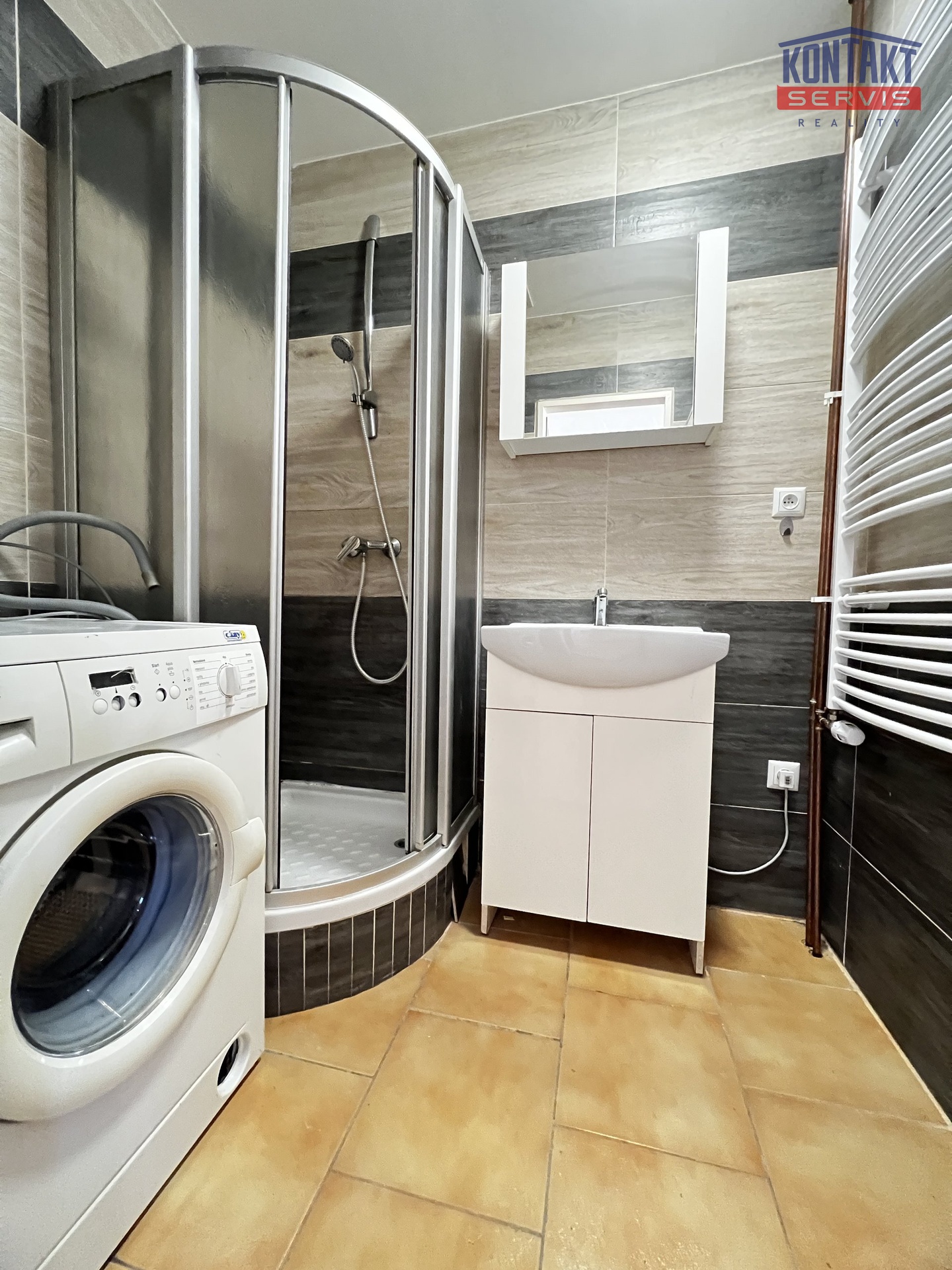 V koupelně nalezneme sprchový box a skříňku s umyvadlem a baterií a horní skříňku se zrcadlem, koupelna je vybavena pračkou Bosch. Samostatné WC.