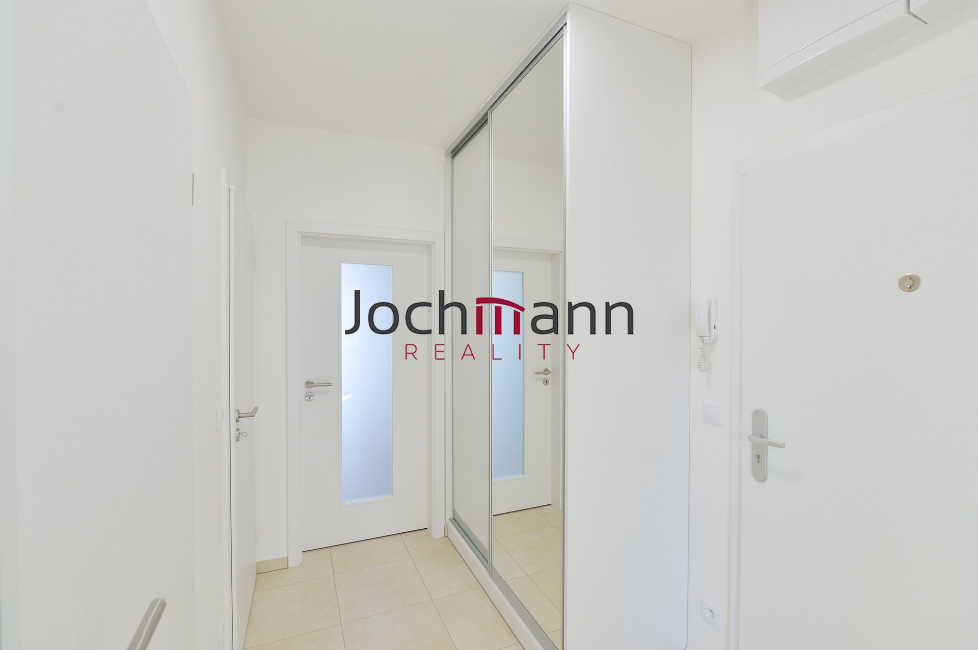 Dispozice bytu nabízí vstupní chodbu s vestavěnou šatní skříní, koupelnu s vanou se zástěnou a toaletou a samostatný prostor pro pračku se sušičkou. Dále je k dispozici ložnice a hlavní obytná místnost se vstupem na terasu, ze které je výhled do klidného vnitrobloku. Byt je vybaven značkovou moderní kuchyňskou linkou vč. vestavných spotřebičů (varná deska, trouba, digestoř, mikrovlnka, myčka, samostatná lednice s mrazákem) a stropními svítidly. V celém bytě je podlahové vytápění a dům je napojen na teplárnu. K bytu náleží sklepní kóje a je možné pronajmout parkovací stání ve dvoře domu za poplatek 1 000 Kč/měsíc.