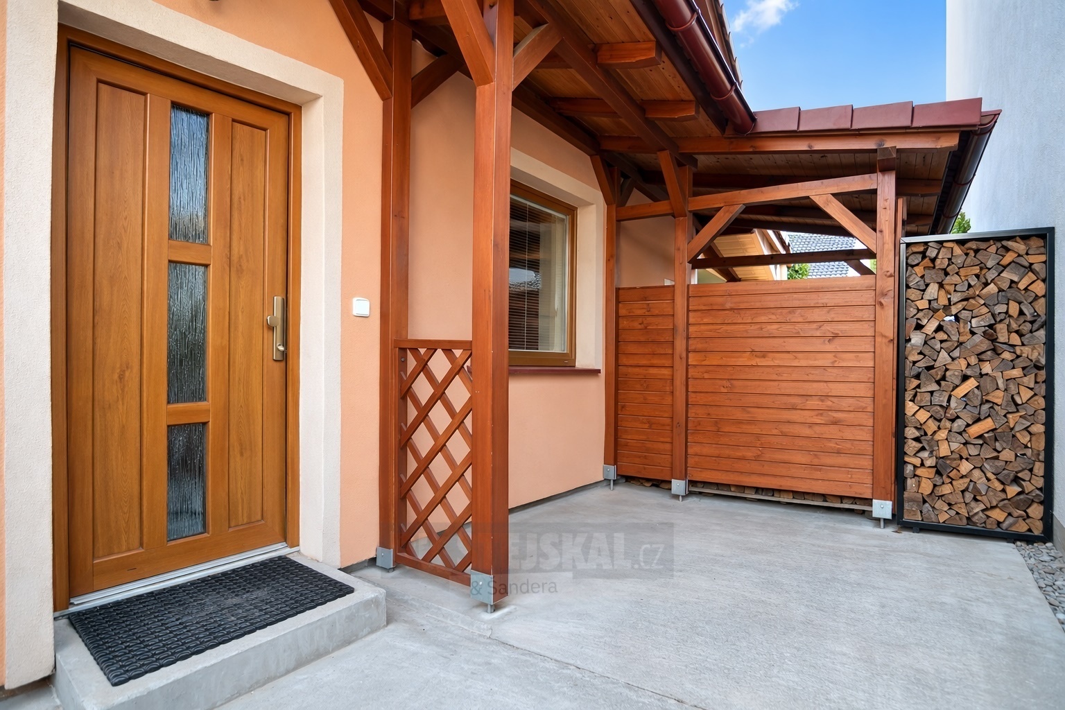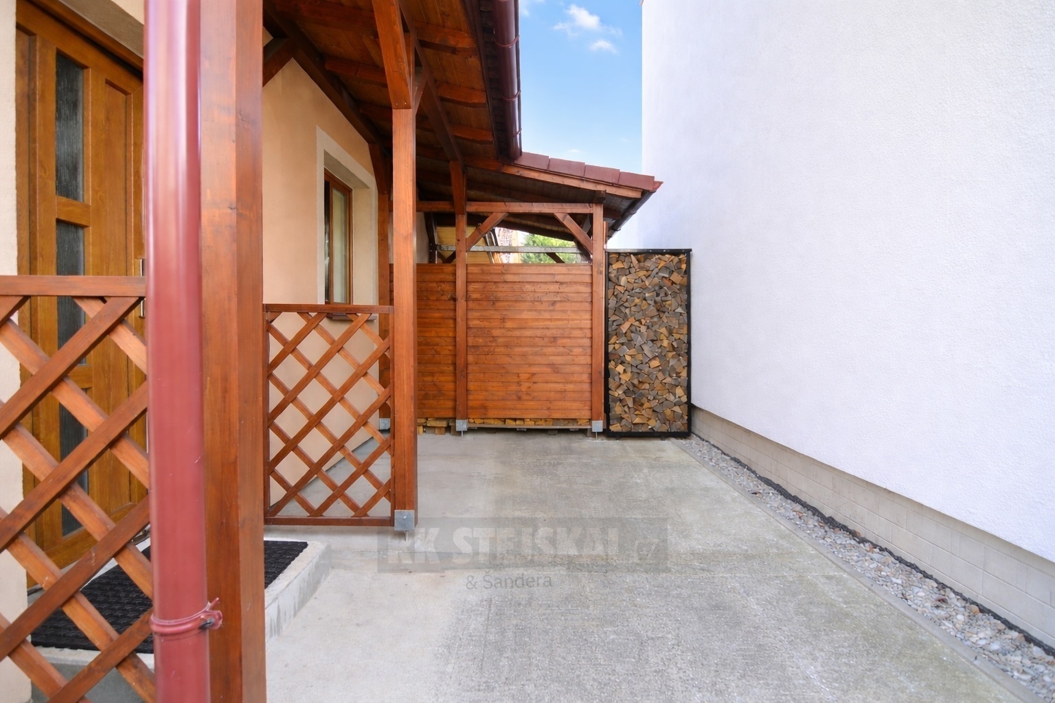 Součástí je také venkovní prostor o velikosti cca 27 m², který nabízí možnost posezení. Část prostoru je zastřešena a nachází se přímo vedle vstupu do domu.