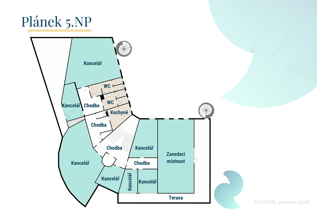 Nabízíme Vám 7 kanceláří ve 5.NP o rozloze 378 m2. Na patře je také společná kuchyňka a toalety. K využití dvě terasy o výměře 20 m2 a 63 m2.