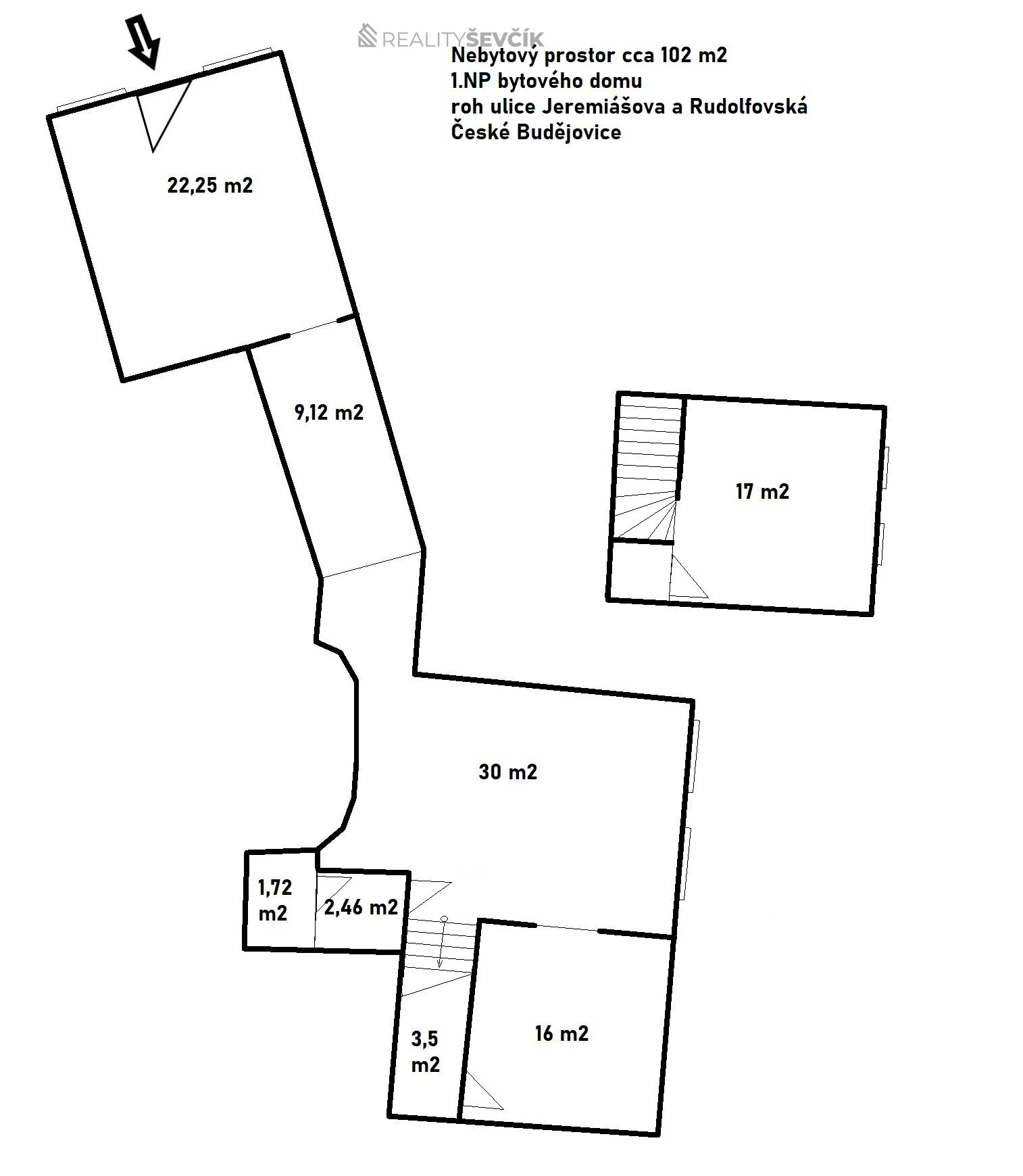 Pronájem nebytového prostoru 102 m² – České Budějovice, Jeremiášova x Rudolfovská