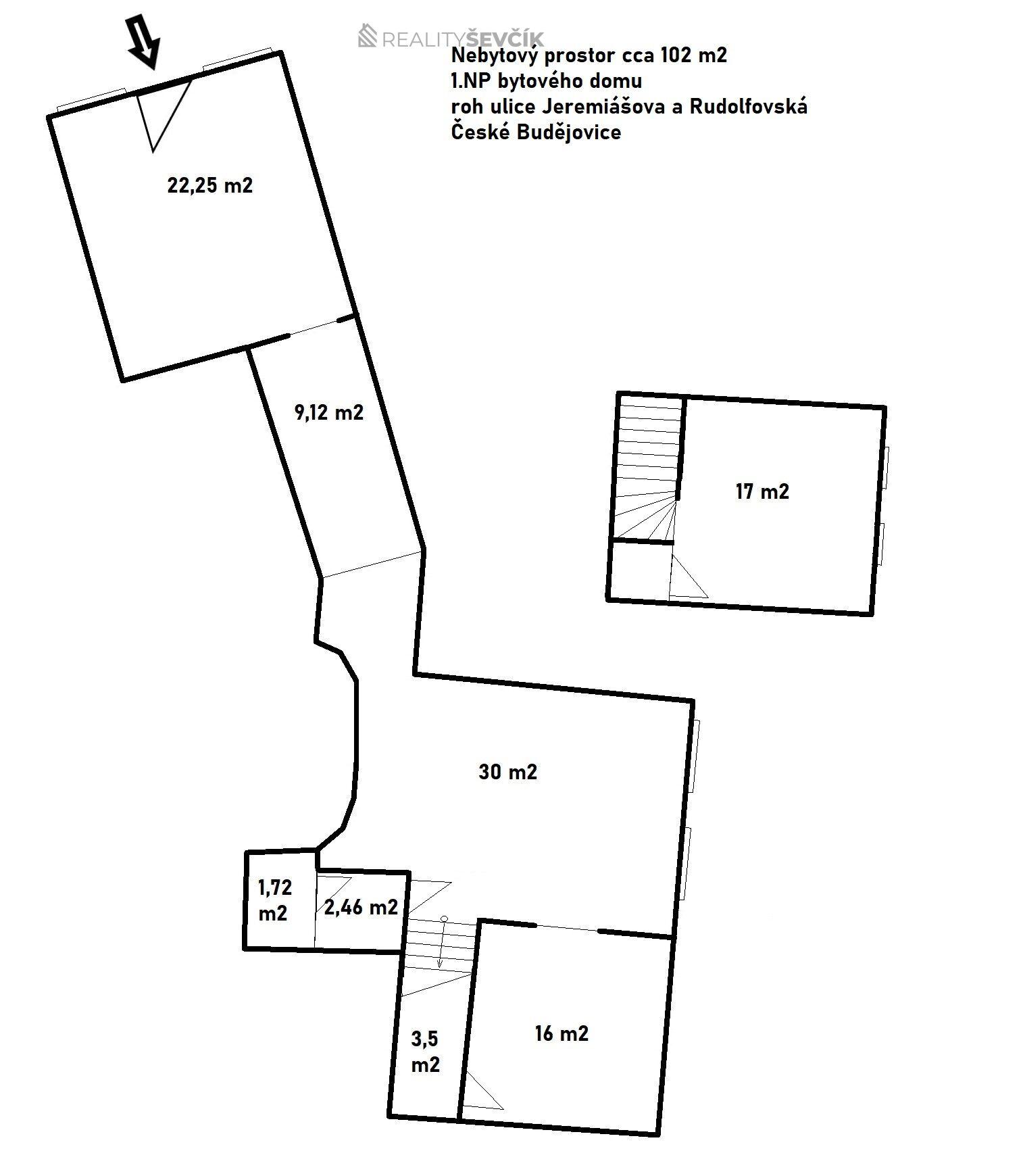 Pronájem nebytového prostoru 102 m² – České Budějovice, Jeremiášova x Rudolfovská