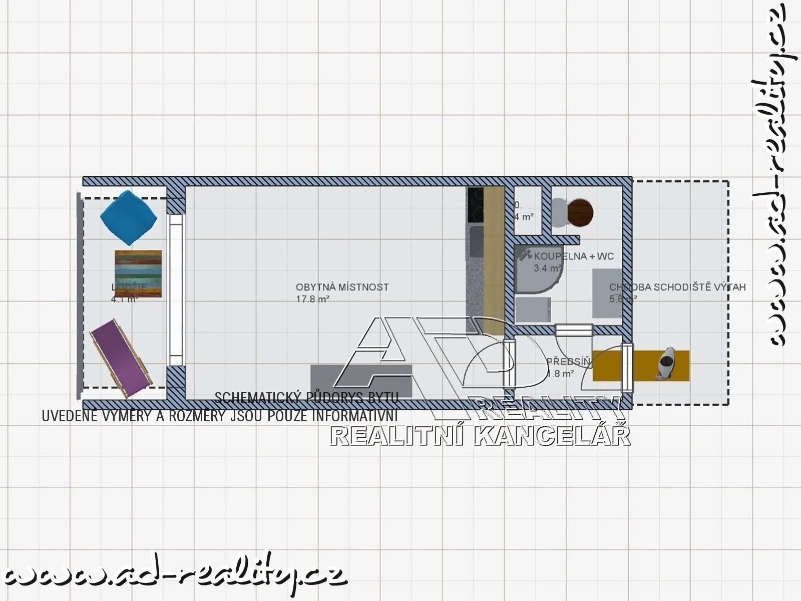 Celková užitná plocha bytu [28m2], podlahová plocha bytu [23m2] + lodžie [4,1m2] + sklepní koje cca [1m2].