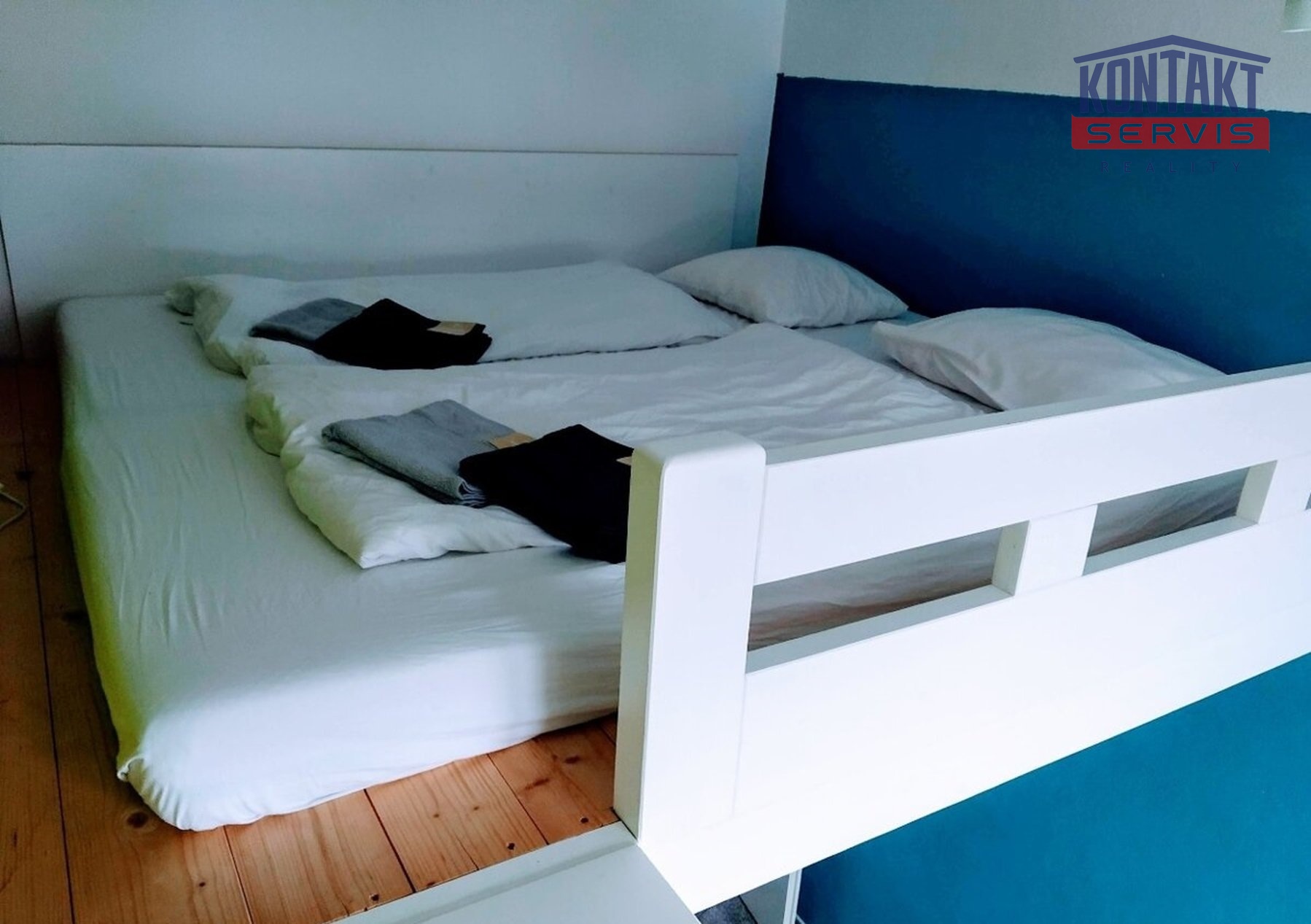 Dispozice bytu: vstupní předsíň, koupelna s pračkou, WC zvlášť, zařízená kuchyň s obývacím pokojem a ložnice s patrovým spaním. K dispozici je také prostorný sklep, kumbál a společná zahrada.