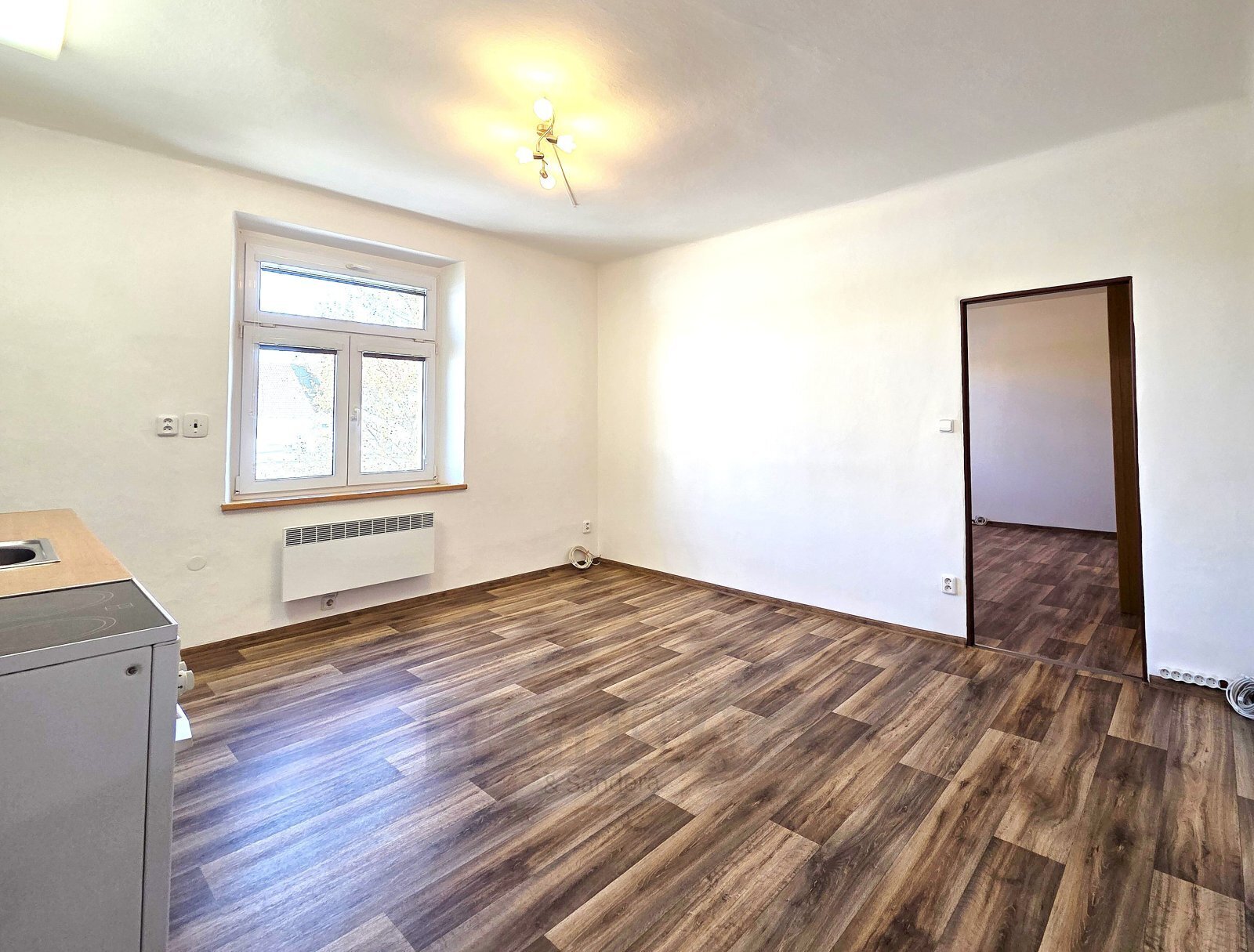 Dispozice je praktická – vstupní chodba, obývací část s kuchyňským koutem, samostatná ložnice a koupelna se sprchovým koutem.