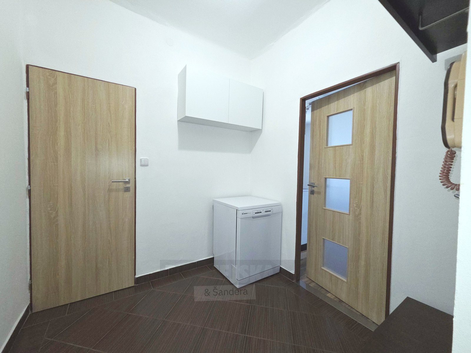 Kuchyňská linka už je na místě, stejně jako prostorná šatní skříň. Nechybí příprava na pračku a možnost instalace myčky.