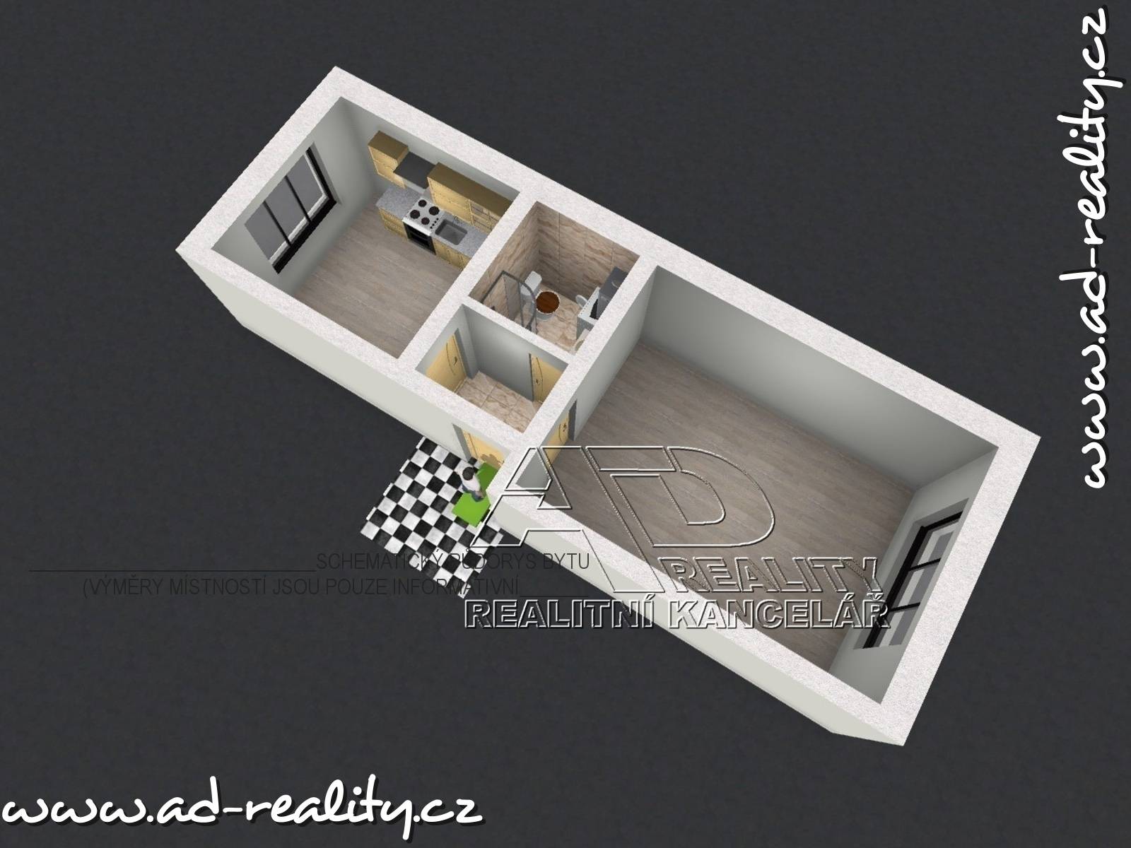 Dispozice: obytná místnost – pokoj [22.3m2], obytná kuchyně [11.8m2], předsíň [2.3m2], koupelna s WC [3.6m2].