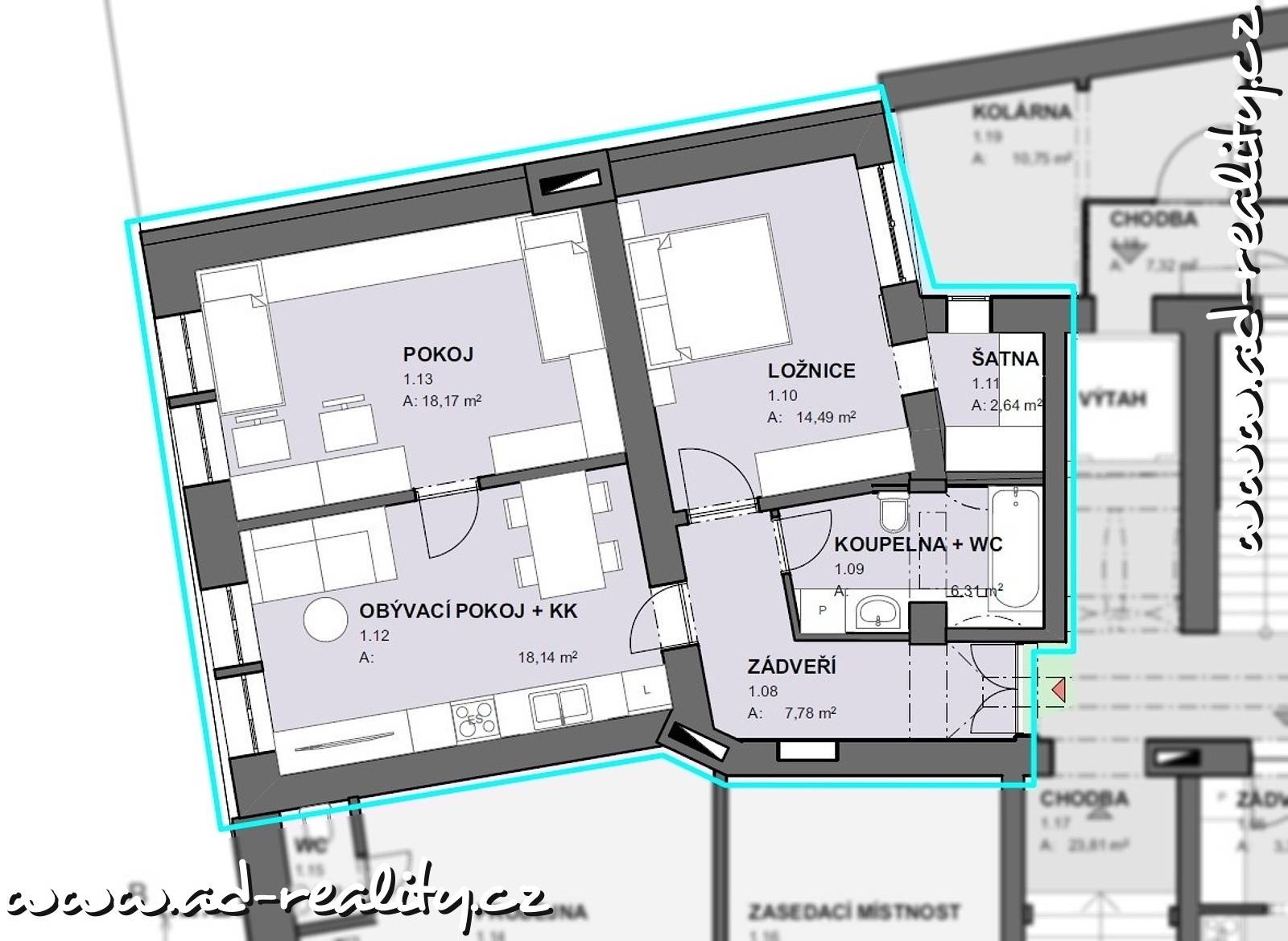 Dispozice bytové jednotky: předsíň [6,2m2], obytná místnost s kuchyňským koutem [18m2], koupelna + WC [5,5m2], ložnice [14m2] se šatnou [3m2], pokoj [18,5m2]. K dispozici je sklepní kóje ve vnitrobloku o výměře [2m2].