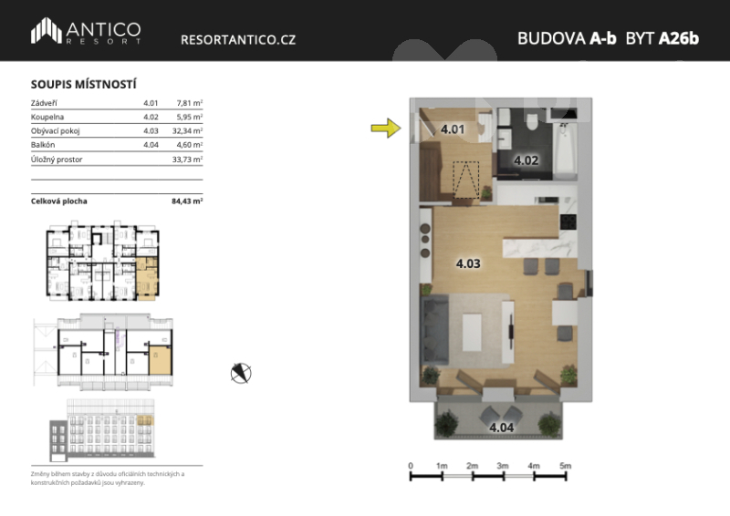 Byt se nachází ve 4., nejvyšším patře vilového domu s výtahem v nové moderní čtvrti Antico. Je perfektně členěný a dostatečně prostorný, takže i dispozice 2+kk nabízí komfortní bydlení.