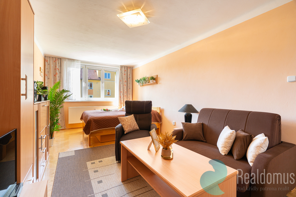 Byt má prostorný obývací pokoj, ložnici s balkónem a útulnou kuchyni vybavenou sklokeramickou deskou a elektrickou troubou. Koupelna je zděná a najdete v ní vanu i toaletu. Součástí bytu je také sklep, kam pohodlně uložíte vše, co nepotřebujete každý den.