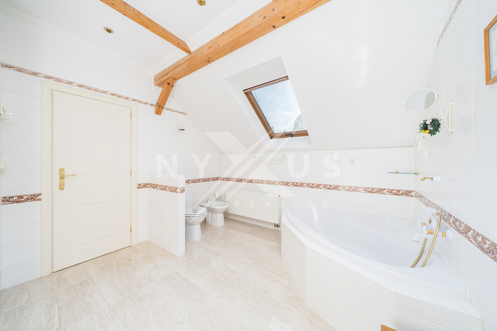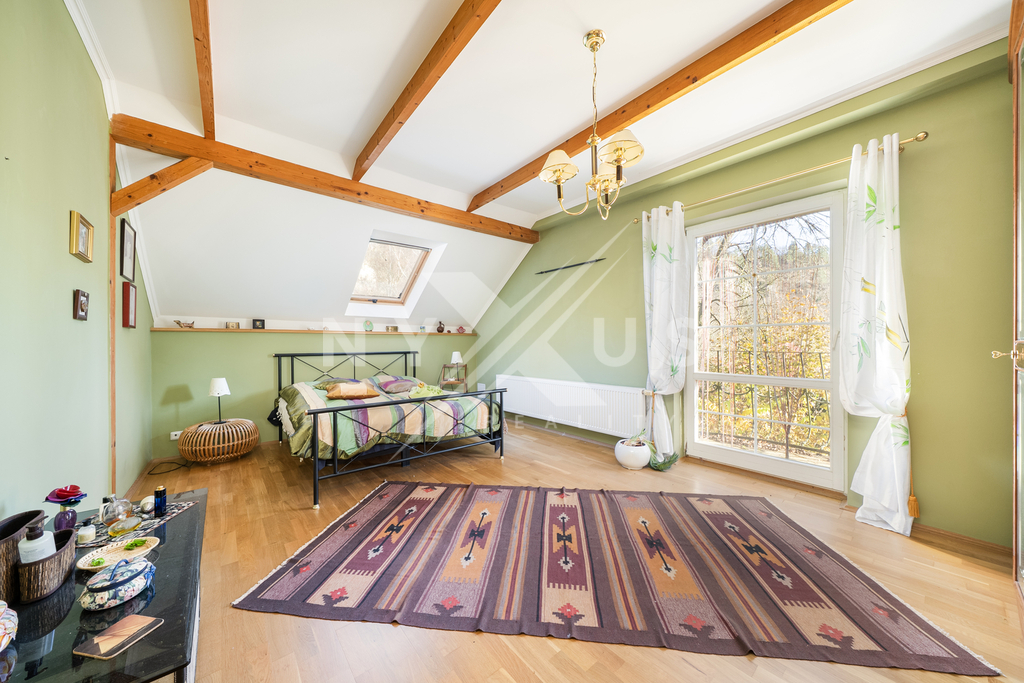 V patře o užitné ploše 82 m² se nachází prostorná hala, koupelna s vanou a dvě útulné ložnice, z nichž každá má vlastní balkon o velikosti 3 m² a kamna na dřevo.