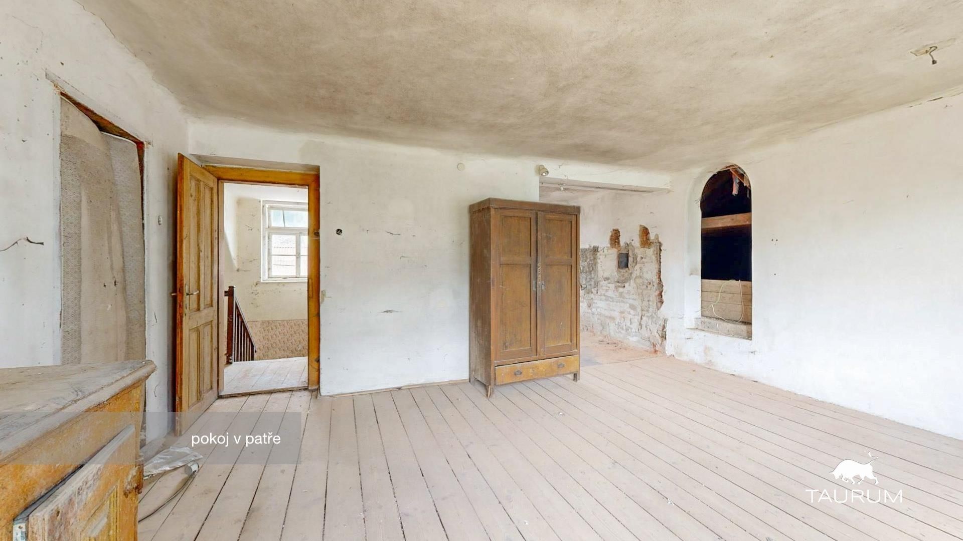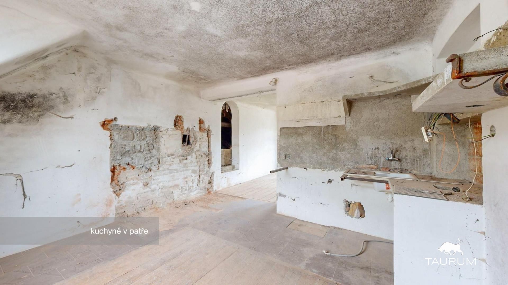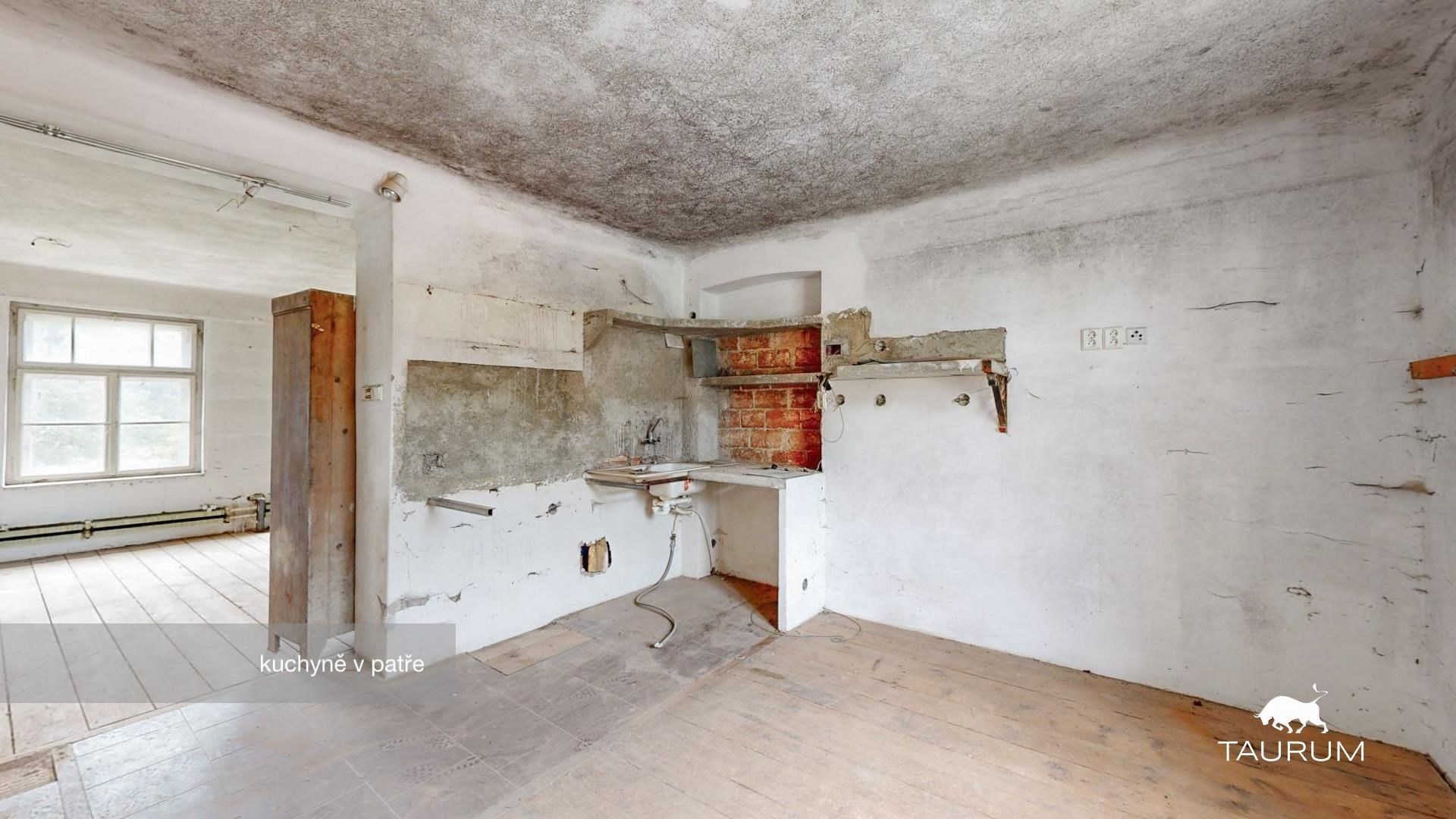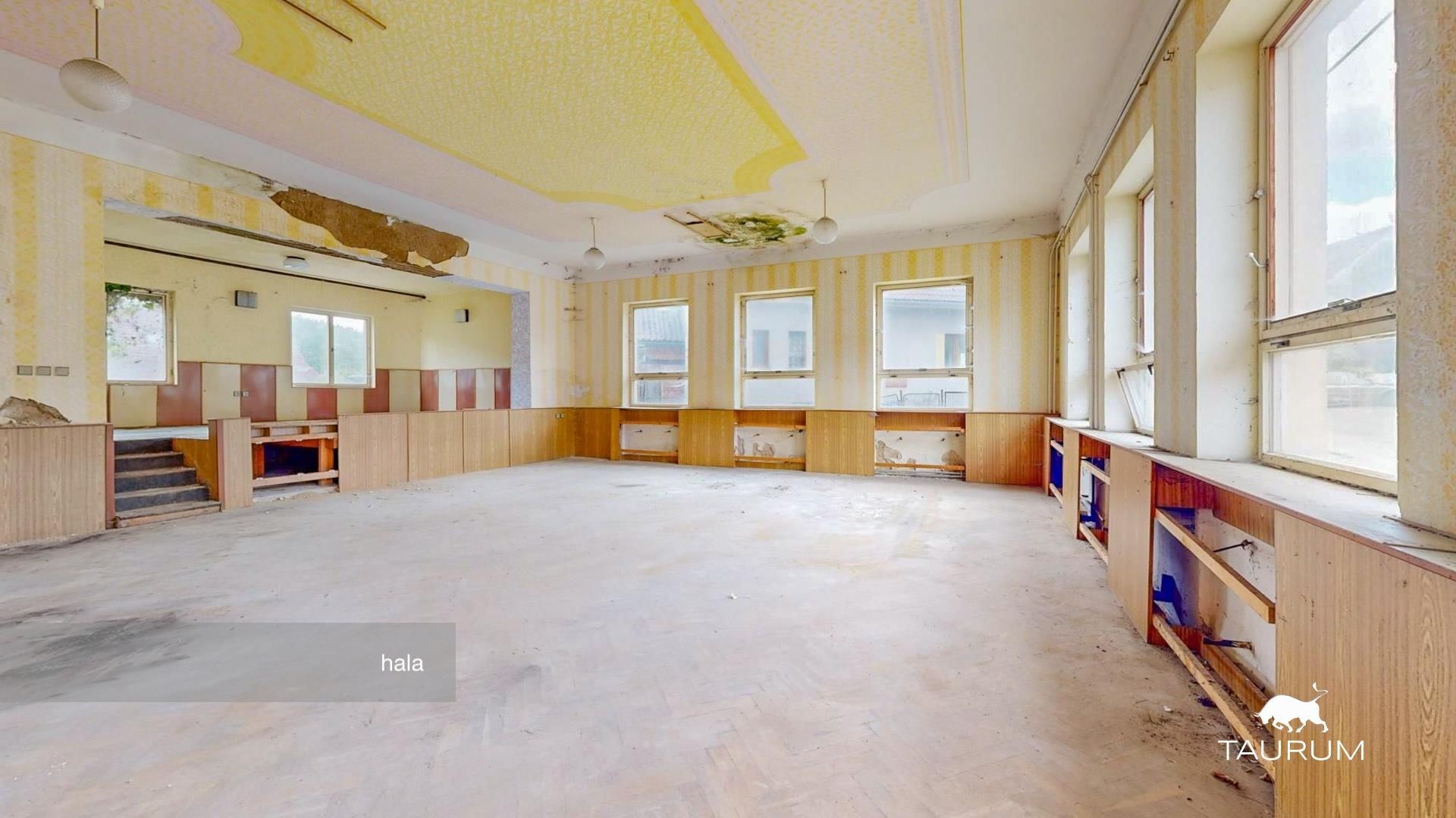 > 1. NP – 254 m² užitné plochy (v minulosti využíváno jako hospoda, sál s pódiem, toalety pro muže/ženy)