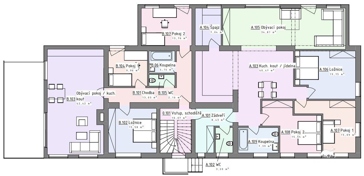 > Zřízení až 3 samostatných bytových jednotek (návrh půdorysu k dispozici)