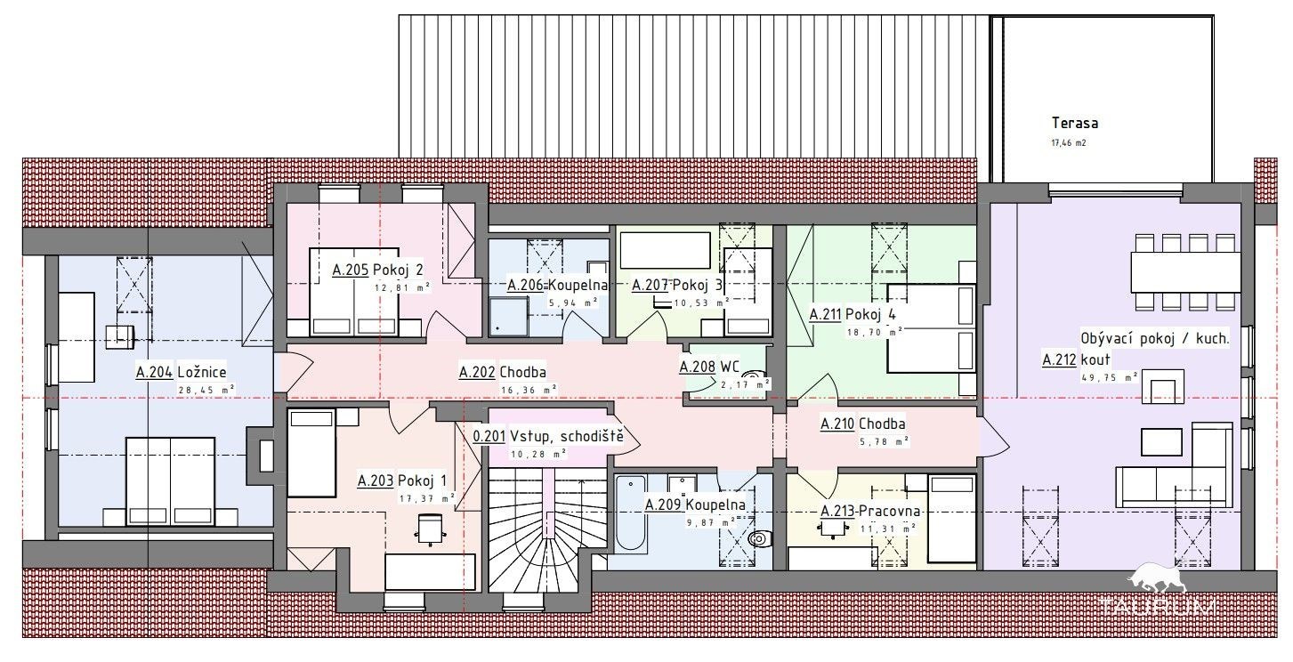 > Podkroví – 172 m² (již dva zbudované pokoje, možnost rozšíření)