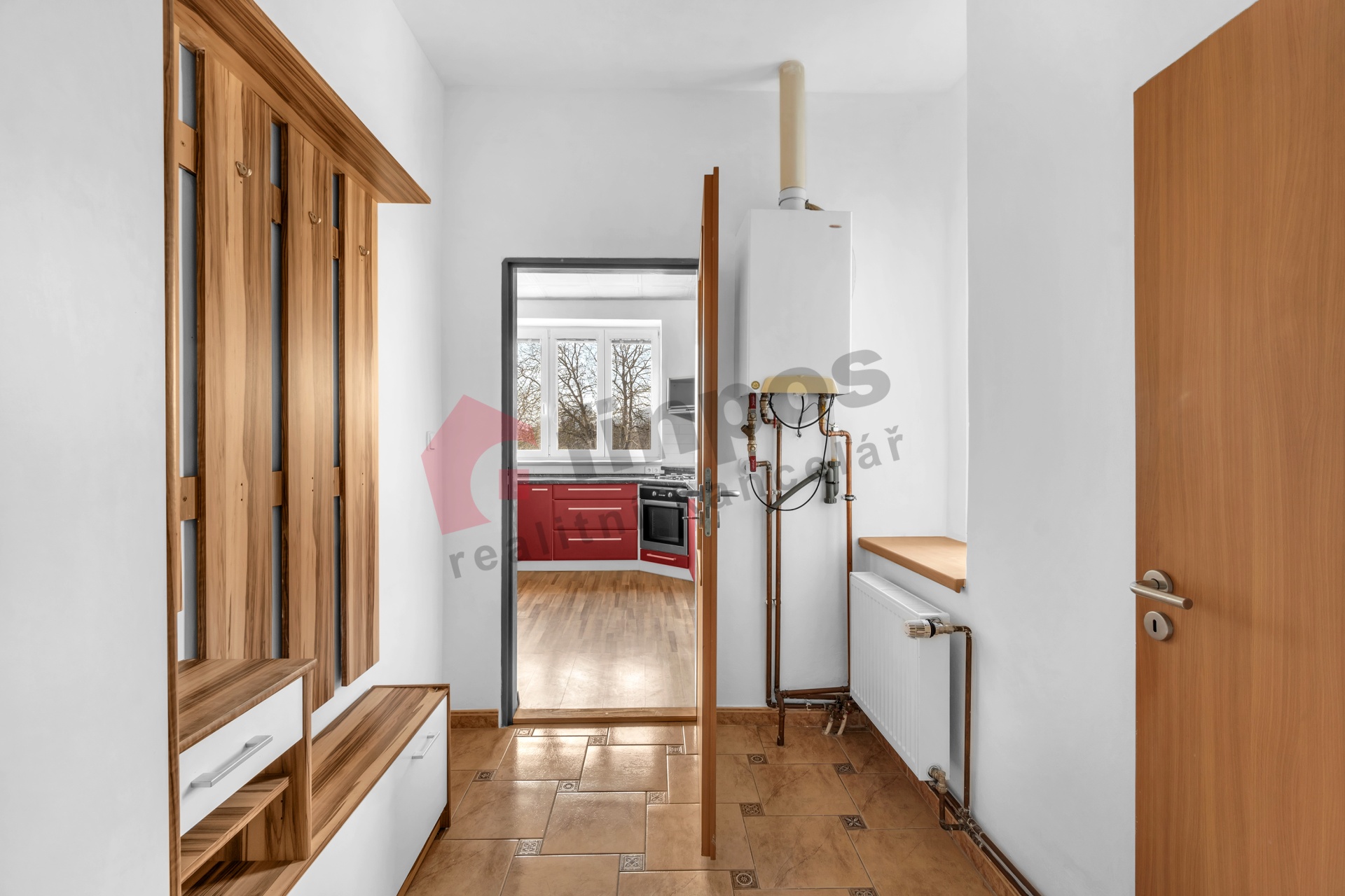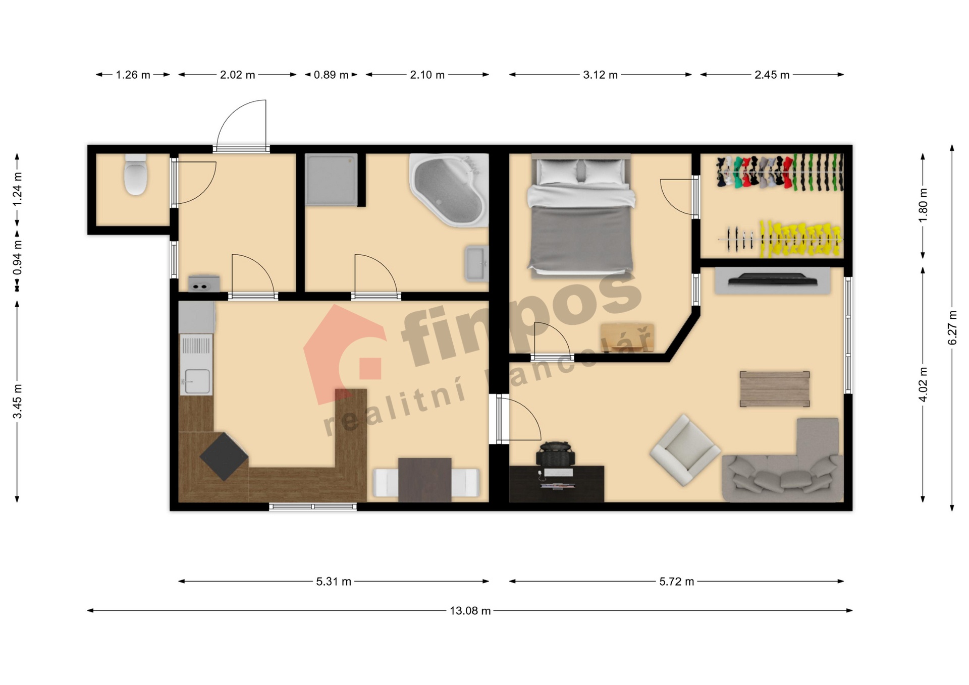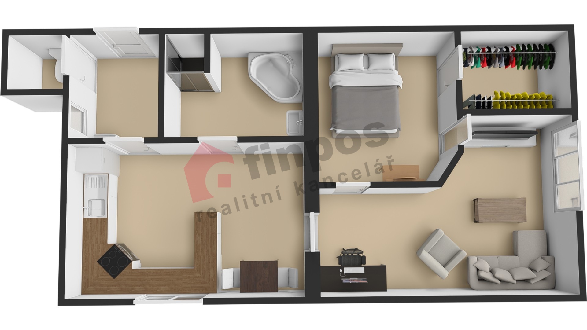 Dispozice bytu nabízí vstupní chodbu s umístěným plynovým kotlem, samostatné WC, koupelnu s vanou i sprchovým koutem, kuchyni, obývací pokoj, ložnici a praktickou šatnu, která zajišťuje dostatek úložných prostor.
