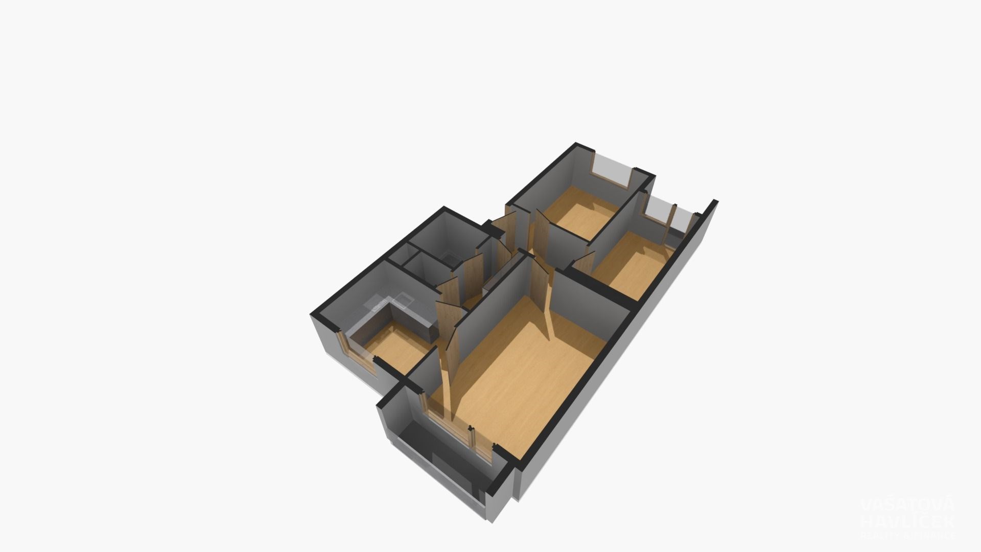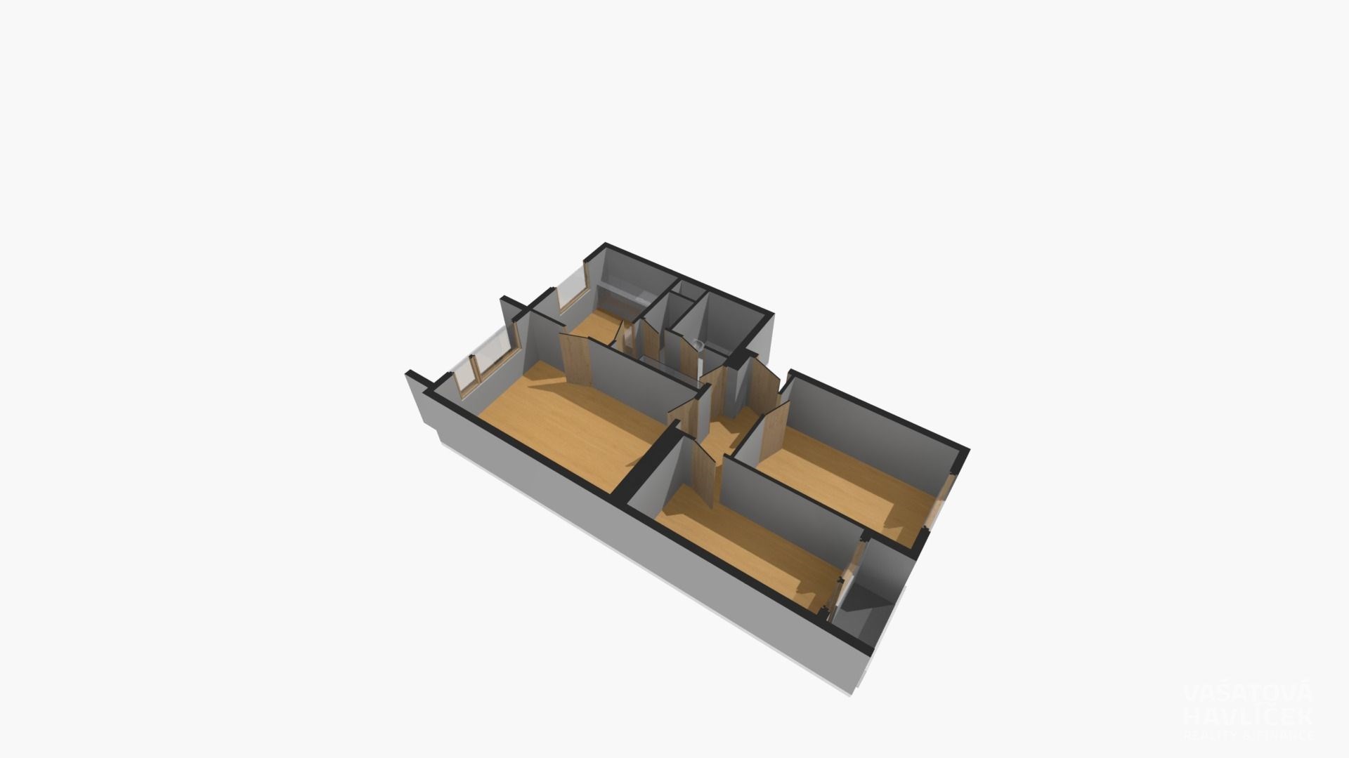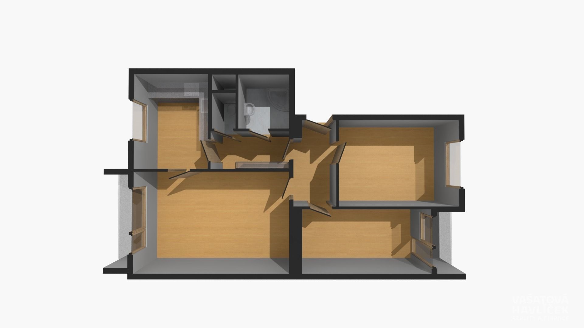 Byt je v osobním vlastnictví s orientací na dvě světové strany – dva pokoje s lodžií směřují na východ, obývací pokoj s kuchyní a s balkonem na západ. Dispozice: vstupní chodba, dva neprůchozí pokoje, obývací pokoj, kuchyň, koupelna se sprchovým koutem, samostatná toaleta, chodba, balkon a lodžie.