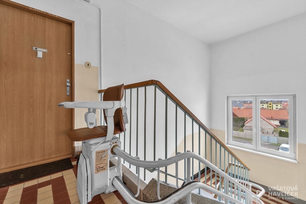 Byt je umístěný ve 3. patře cihlového domu bez výtahu, kde je absence výtahu vyřešena zabudovanou schodišťovou sedačkou, která zajišťuje pohodlnější přístup. Součástí je zasklený balkon (2,7 m²) a lodžie (2,4 m²), které rozšiřují obytný prostor a zvyšují komfort bydlení.