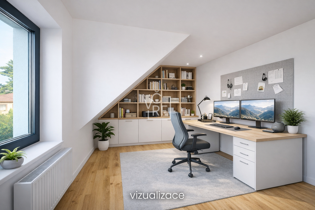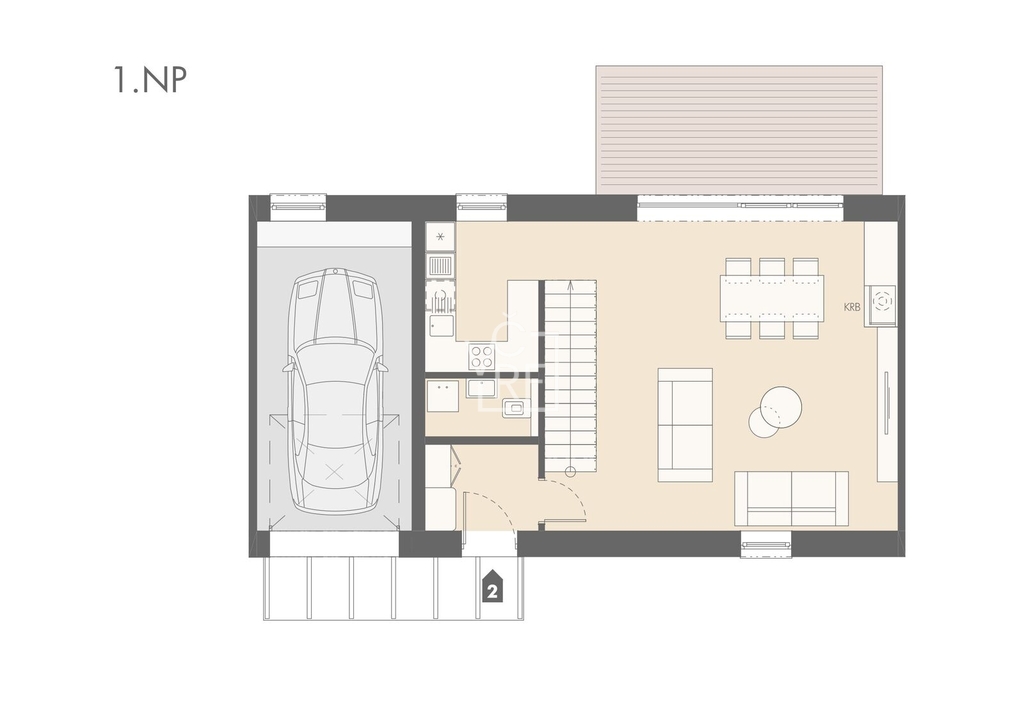 1.NP garáž s průchodem na zahradu, vstup, předsíň, WC, obývací pokoj se vstupem na terasu a schodištěm do patra, kuchyňský kout,