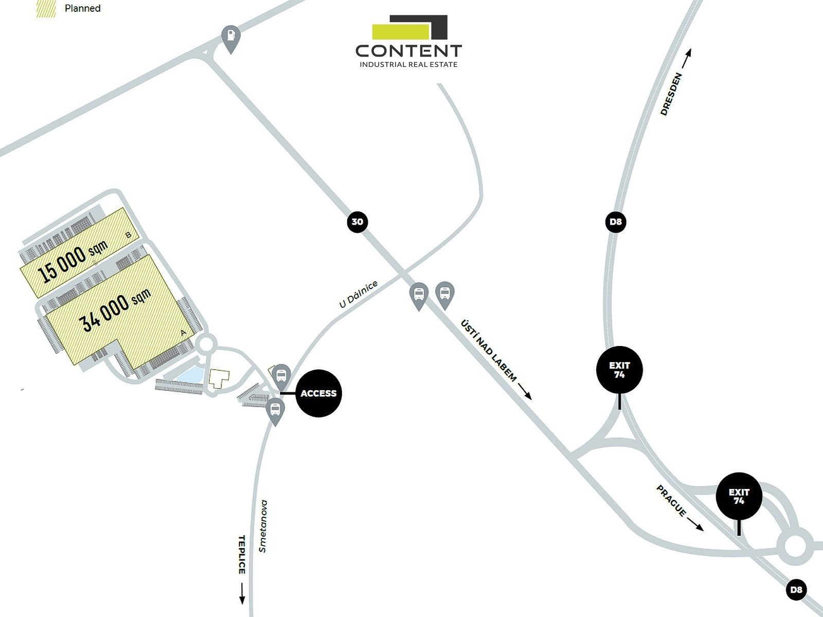 Bez provize nabízíme skladové nebo výrobní prostory v nově vznikajícím industriálním parku, s rychlým napojením na dálnici D8: