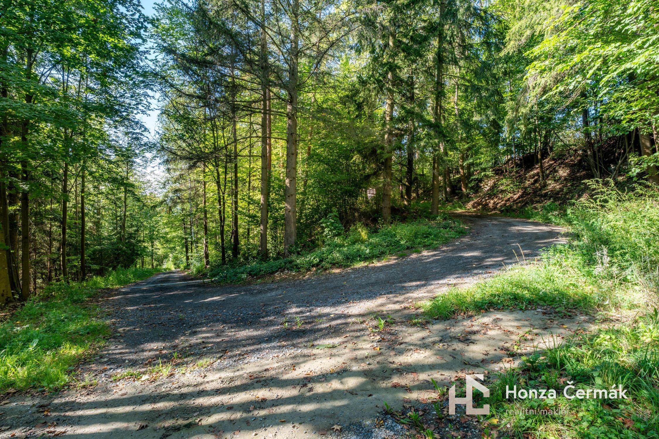 Příjezdová cesta je štěrková a vede do mírného kopce. Díky stromům po jejích stranách zde ale v zimě nebývá větší množství sněhu. Pro pohodlný vjezd na pozemek bude potřeba odkopat část svahu a vybudovat nájezd.