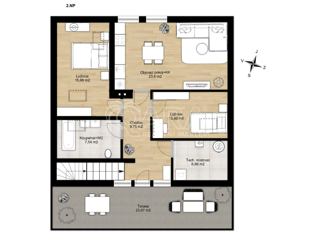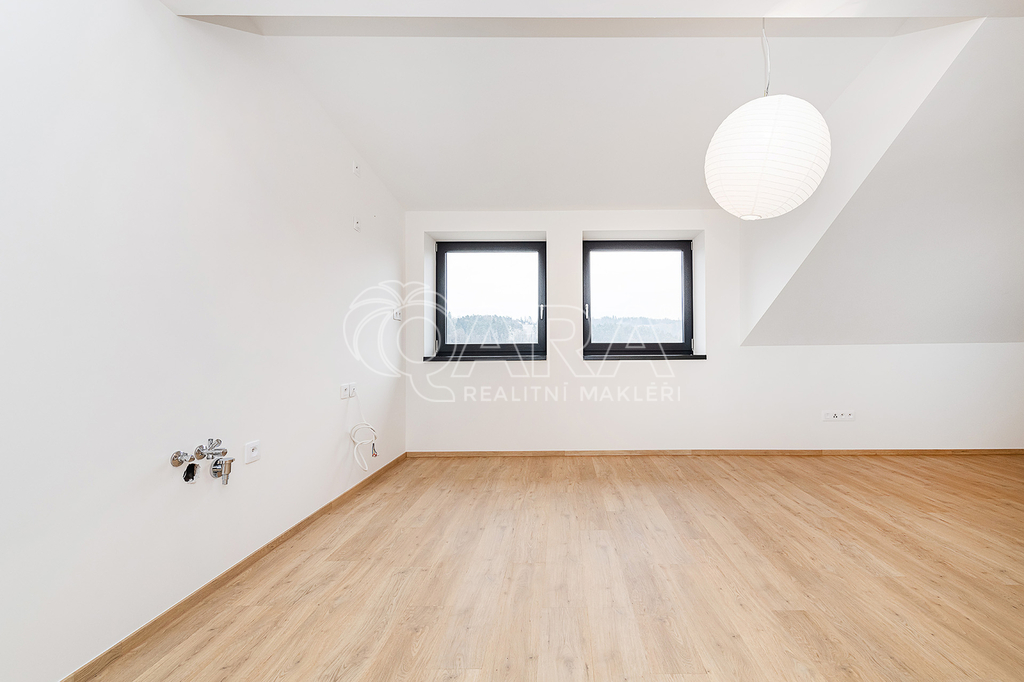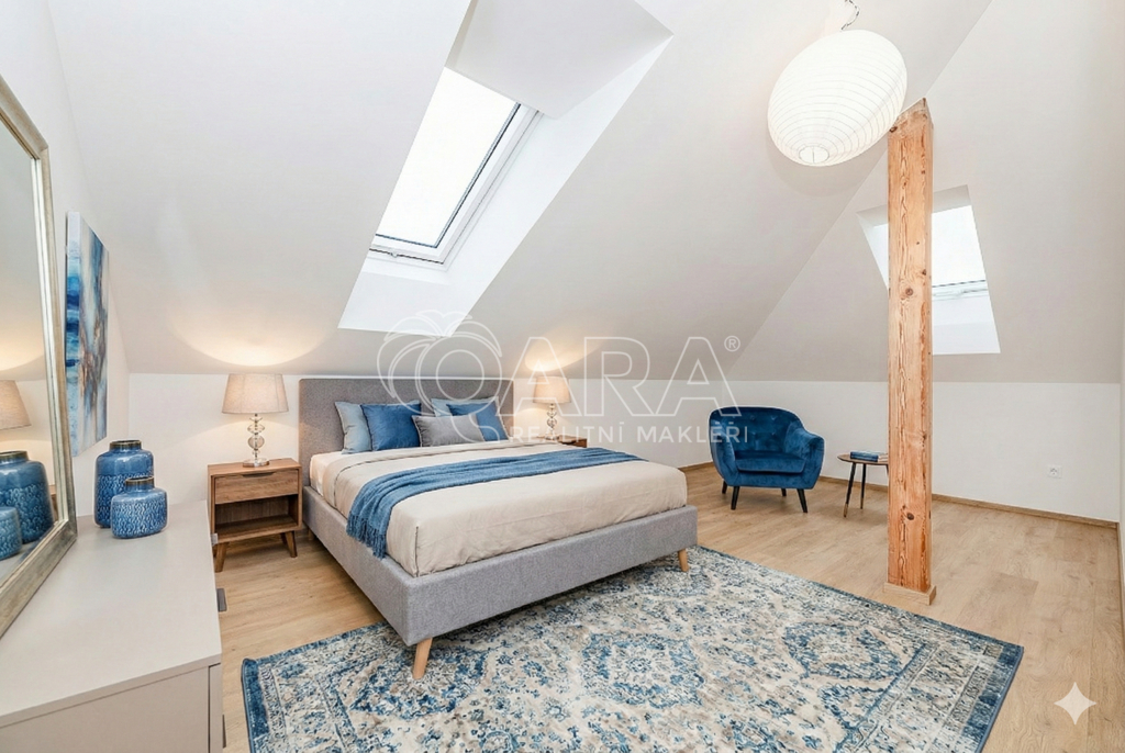 Útulná jednotka s vlastním balkonem (27 m²). Obývací pokoj s kuchyní (23,6 m²), dvě ložnice se střešními okny a koupelna.
